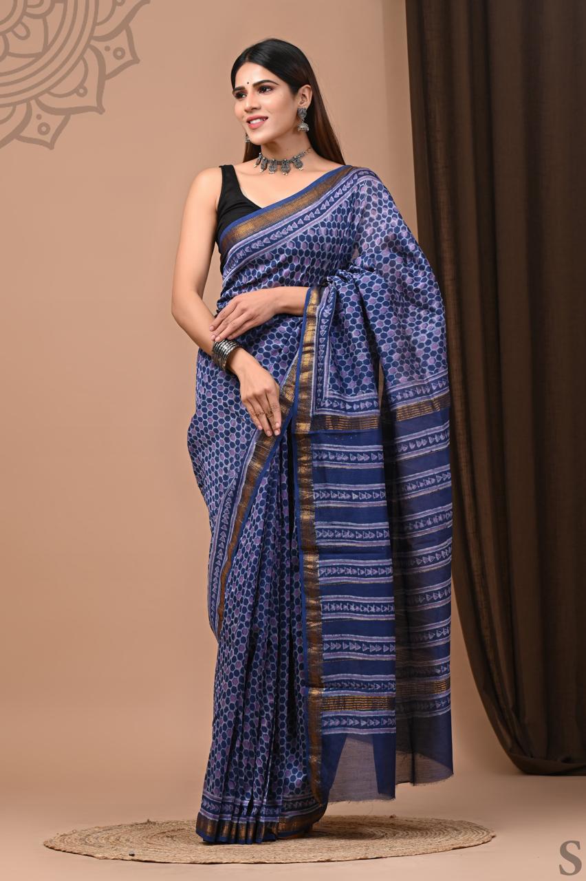 A beautiful saree in a rich royal blue shade, featuring an all-over white block print of small circular or dot-like patterns. The pallu is a harmonious blend of blue and white stripes with a mix of traditional patterns. A fine gold border with a delicate blue line adds a touch of regal elegance, making this saree a sophisticated choice for any special occasion.