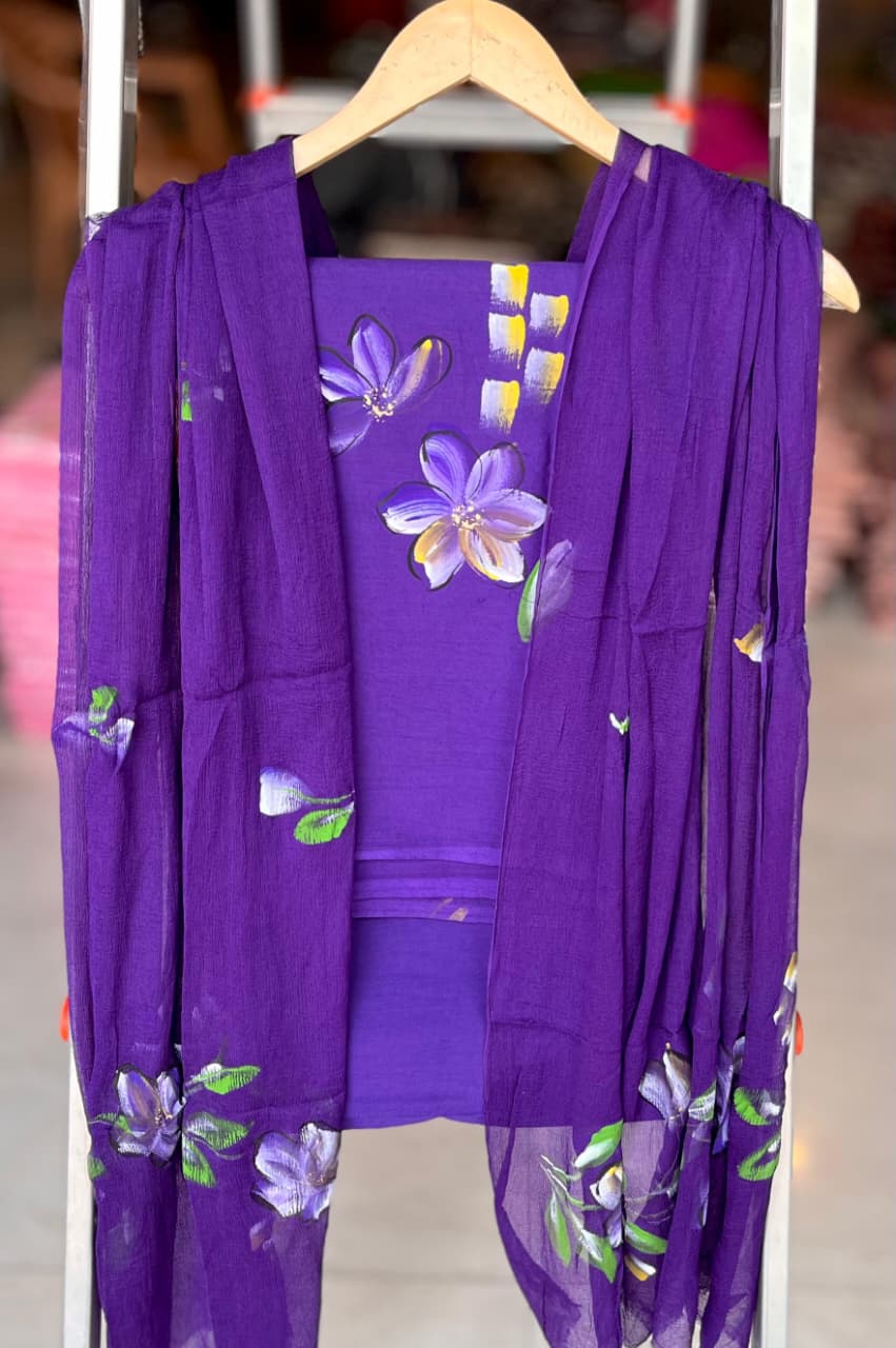 Step into a world of vibrant artistry with our Royal Purple Floral Chiffon Cotton Suit Set. This exquisite ensemble, crafted from 100% pure cotton, embodies the rich traditions of Indian craftsmanship. The delicate floral motifs, hand-painted with care, add a unique flair, making it a true celebration of culture.