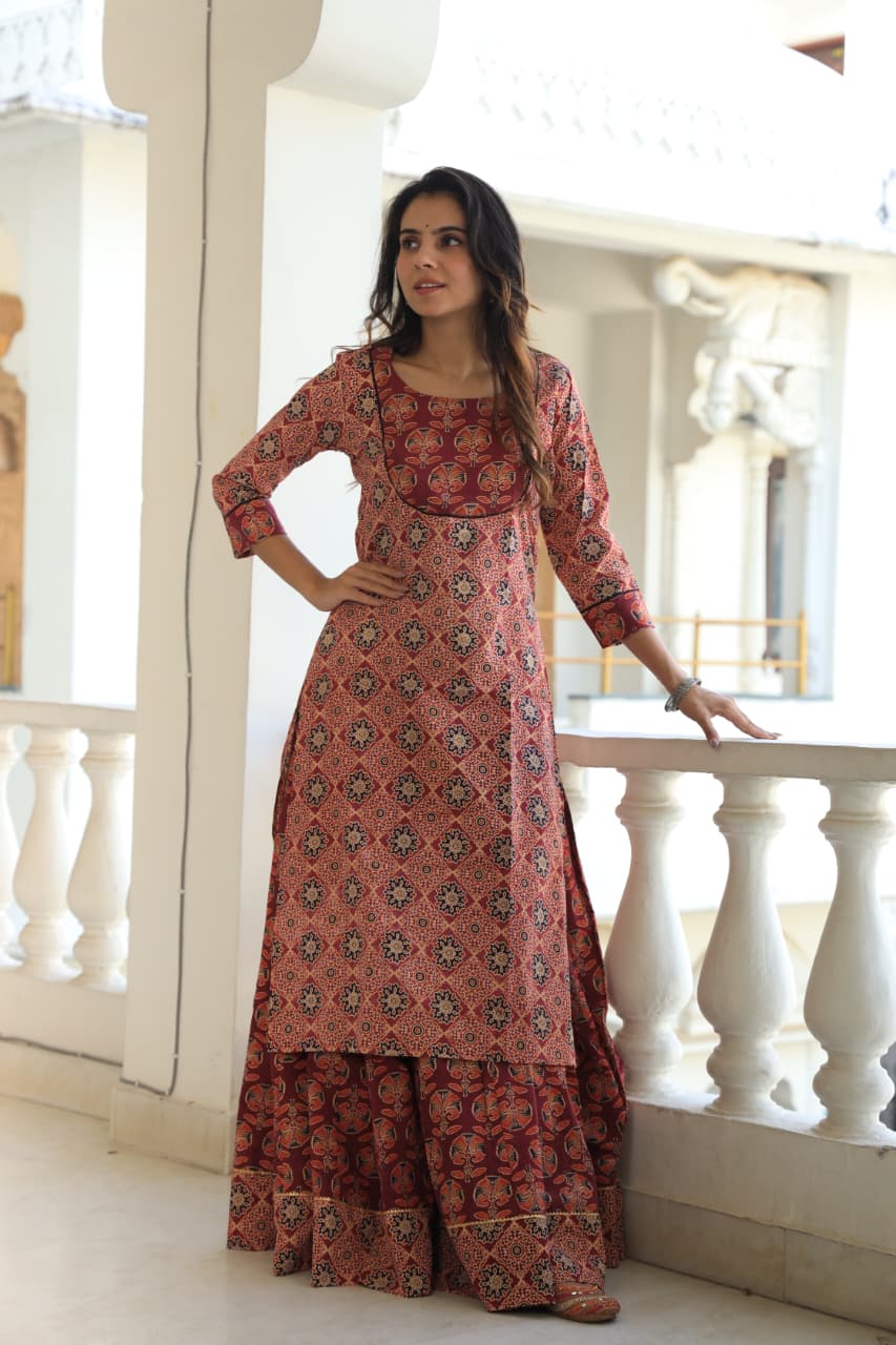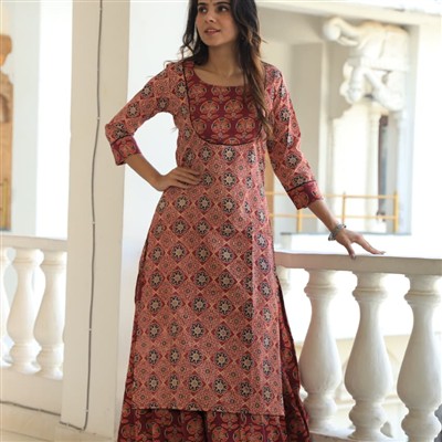 Elevate your ethnic wardrobe with this artisanal ensemble from Blockart. Crafted from soft and breathable cotton, this set features a rust-colored kurta with a yoke design and three-quarter sleeves. The skirt complements with a matching pattern and wide border, showcasing traditional block print motifs. Perfect for cultural events or festive occasions, this outfit combines comfort with timeless craftsmanship.