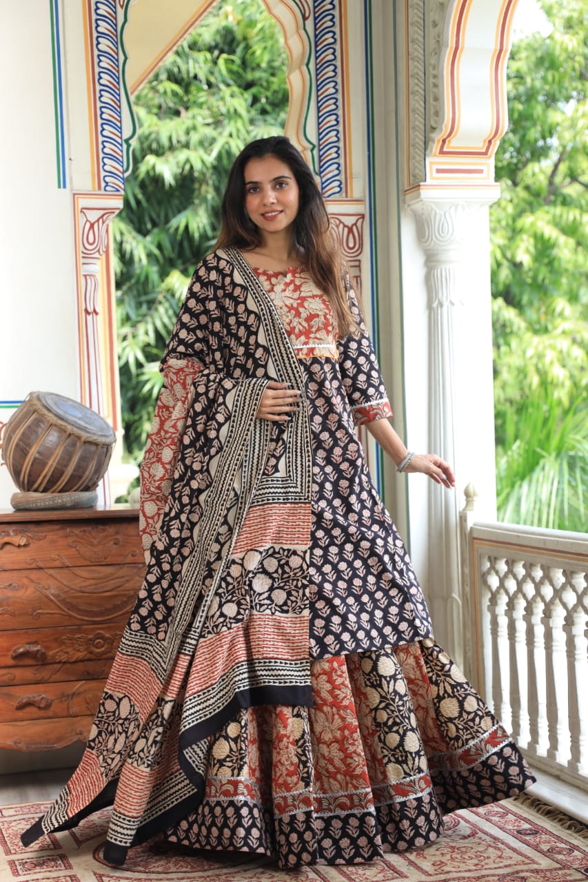 Rust-Orange Floral Cotton Anarkali with Dupatta
