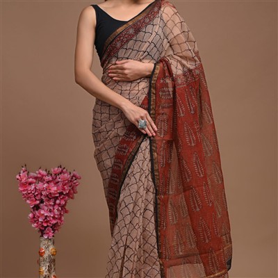 Elevate your ethnic wardrobe with this exquisite Rust-Red Border Kota Doria Saree handcrafted with intricate gold leaf design. Meticulously hand block printed on fine kota doria fabric, this saree exudes traditional charm and elegance. The lightweight and semi-transparent fabric ensure comfort while the detailed border and pallu add a touch of sophistication. Perfect for casual or semi-formal occasions.