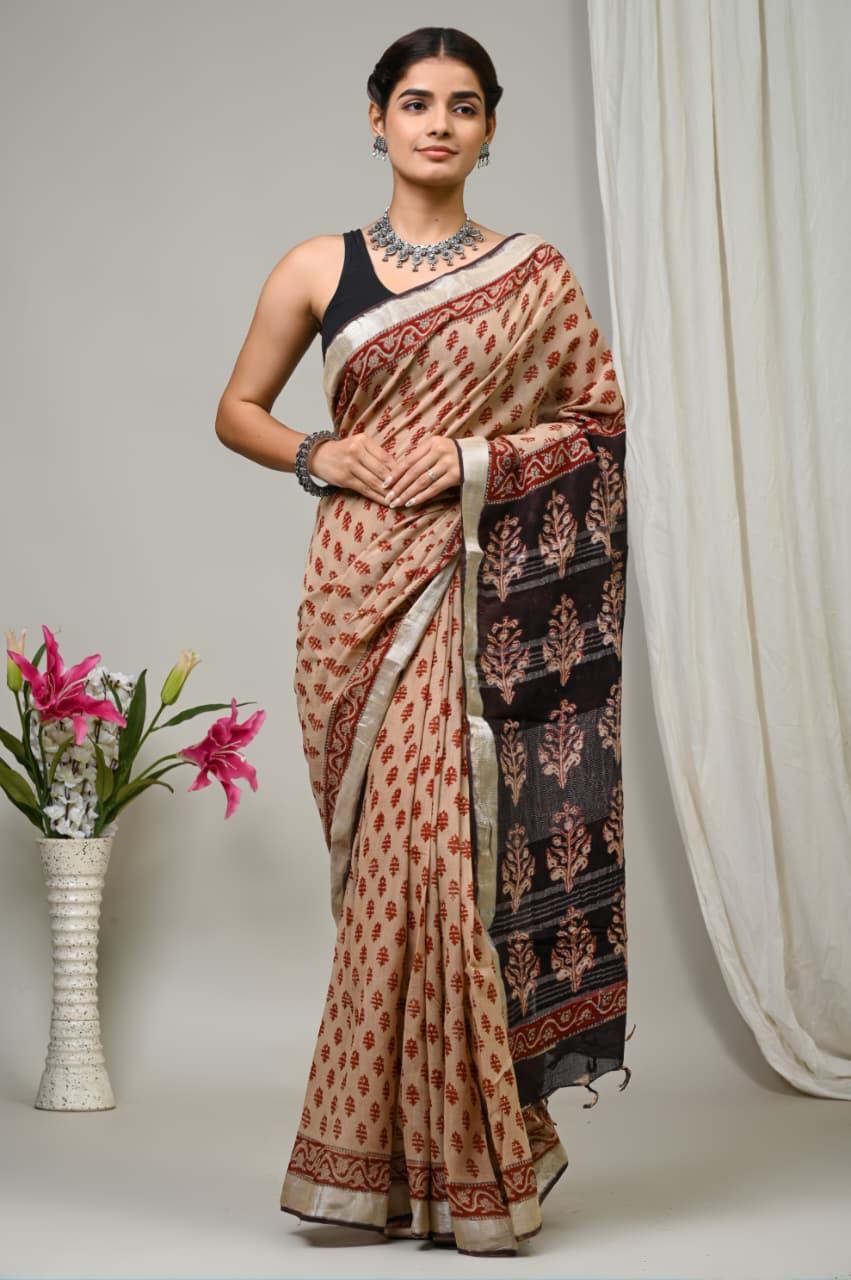 Rooted in the rich tapestry of Indian craftsmanship, this exquisite linen saree brings forth a delightful blend of earthy tones and botanical elegance. The soft beige base serves as a serene backdrop, while the intricate floral motifs in deep burgundy and muted gold dance gracefully across the fabric, reflecting the artisans' dedication and skill.