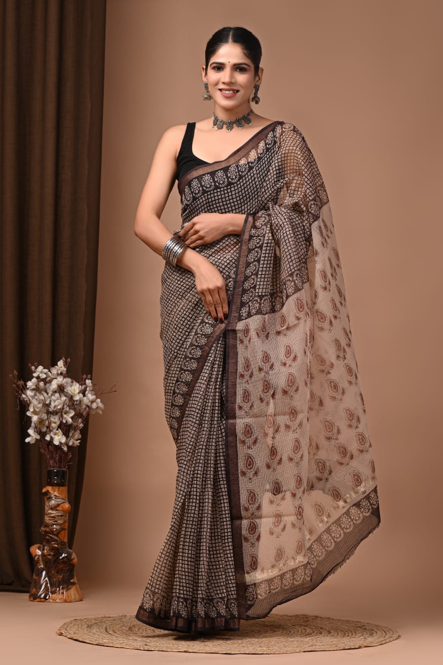 Crafted from pure Kota Doria, the Rustic Charm Geometric Kota Doria Saree envelops you in a warm embrace of earthy tones. The deep brown fabric, enhanced by a soothing beige backdrop, showcases a unique interplay of geometric patterns and delicate floral motifs that reflect the rich tapestry of Indian textile heritage. Each print, meticulously applied using traditional block printing techniques, tells a story of artistry and cultural pride.