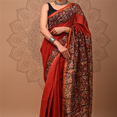 Elevate your ethnic wardrobe with this exquisite Rustic Floral Chanderi Silk Saree. Hand block printed on premium silk fabric, this saree features intricate floral and leaf motifs in black, beige, and hints of red and orange. The border is accentuated with an orange-gold trim, adding a touch of elegance. The smooth silk material drapes beautifully, offering both style and comfort. Perfect for special occasions or cultural events.