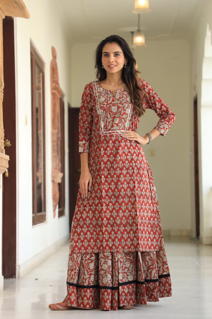 Rustic Floral Hand Block Printed Cotton Kurta and Skirt Set
