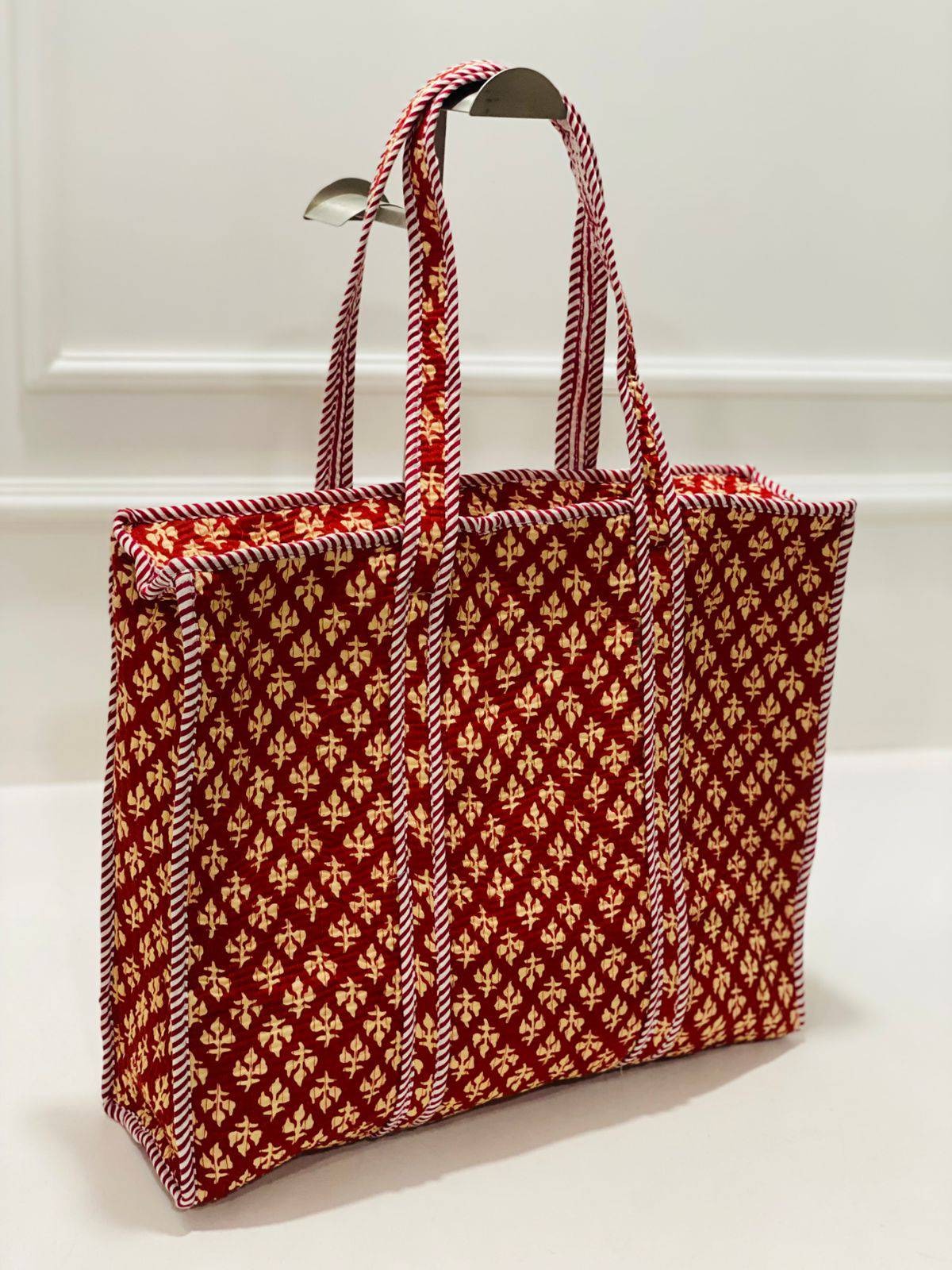 Embark on a journey inspired by the rustic charm of Indian villages with this exquisite Rustic Maroon Floral Block Print Quilted Cotton Tote Bag. Crafted by skilled artisans, this handbag showcases traditional block printing techniques passed down through generations.
