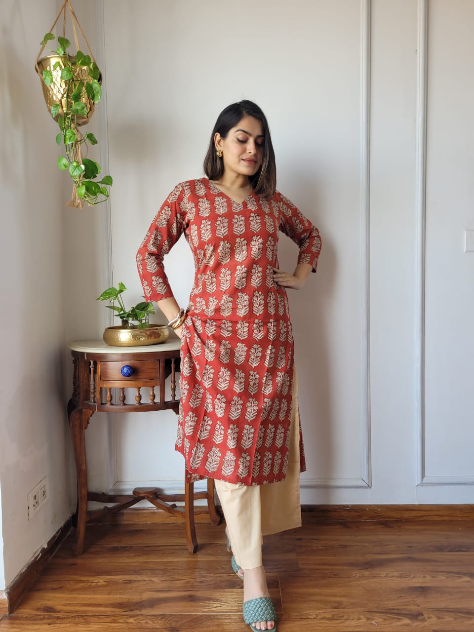 Step into a world of artisanal elegance with our Rustic Orange Leaf Motif Cotton Ensemble. The intricate leaf patterns on the burnt orange kurta exude a sense of traditional charm, while the cream pants offer a versatile pairing. Handcrafted with precision, this ensemble combines artisan techniques with practical comfort, ideal for both casual outings and special gatherings. Feel the connection to Indian craftsmanship with every wear, embracing the heritage of hand block printing.