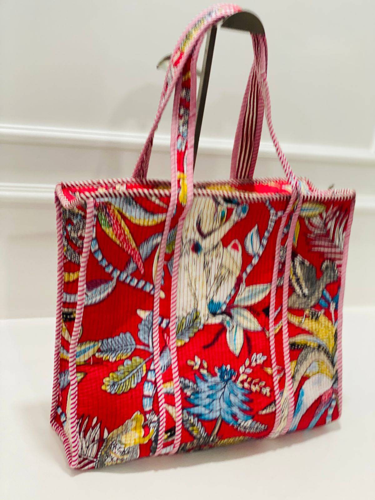 Embrace the charm of this Rustic Red Blossom Quilted Cotton Tote Bag, adorned with a multicolored floral and leaf pattern in shades of blue, yellow, white, and green. The intricate artisan techniques shine through the quilted fabric, showcasing attention to detail and lasting wear. The vibrant colors harmonize beautifully, creating a striking piece ideal for everyday use. Stand out with this structured design that blends traditional Indian craft with modern functionality. Feel the essence of Indian textile traditions in every stitch of this handbag, a true testament to the artistry ingrained in every piece.