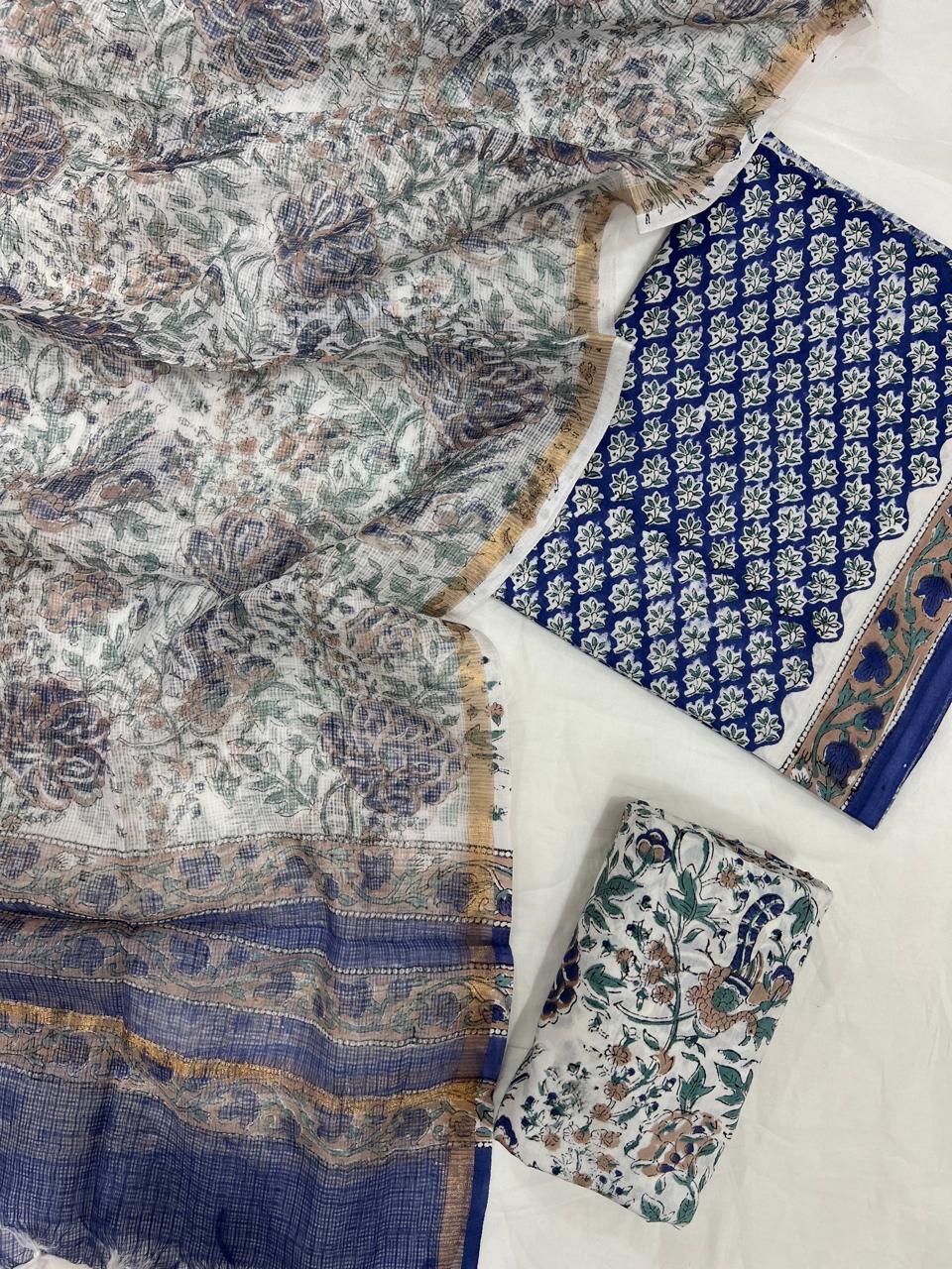 Crafted from soft cotton, this fabric is both breathable and light, ensuring comfort no matter the occasion. The Kota Doria dupatta adds a touch of elegance, perfect for draping over the shoulders or styling as a statement accessory. The combination of muted sage green and rich navy blue tones offers a modern twist, inviting versatile styling options.