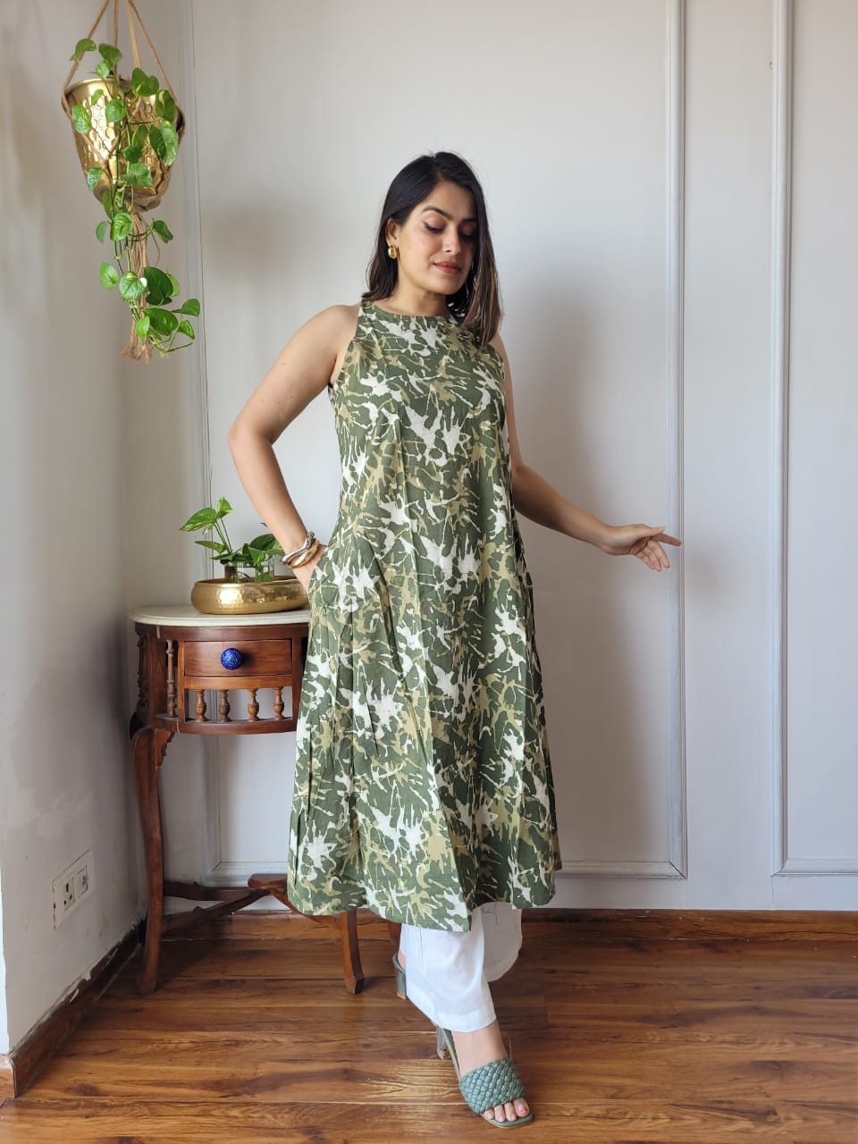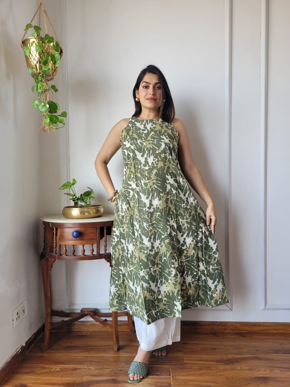 Embark on a journey inspired by Indian textile traditions with the Sage Camouflage Floral Cotton A-Line Kurta Set. Our artisans intricately hand block print a lush green and beige abstract pattern, celebrating nature's beauty. The sleeveless design and A-line silhouette offer a relaxed fit perfect for casual or semi-formal occasions. This artisan-crafted ensemble features side pockets for added functionality. The lightweight cotton fabric ensures all-day comfort, ideal for versatile styling. Experience the essence of Indian craft with this exclusive piece that seamlessly blends tradition with contemporary style.