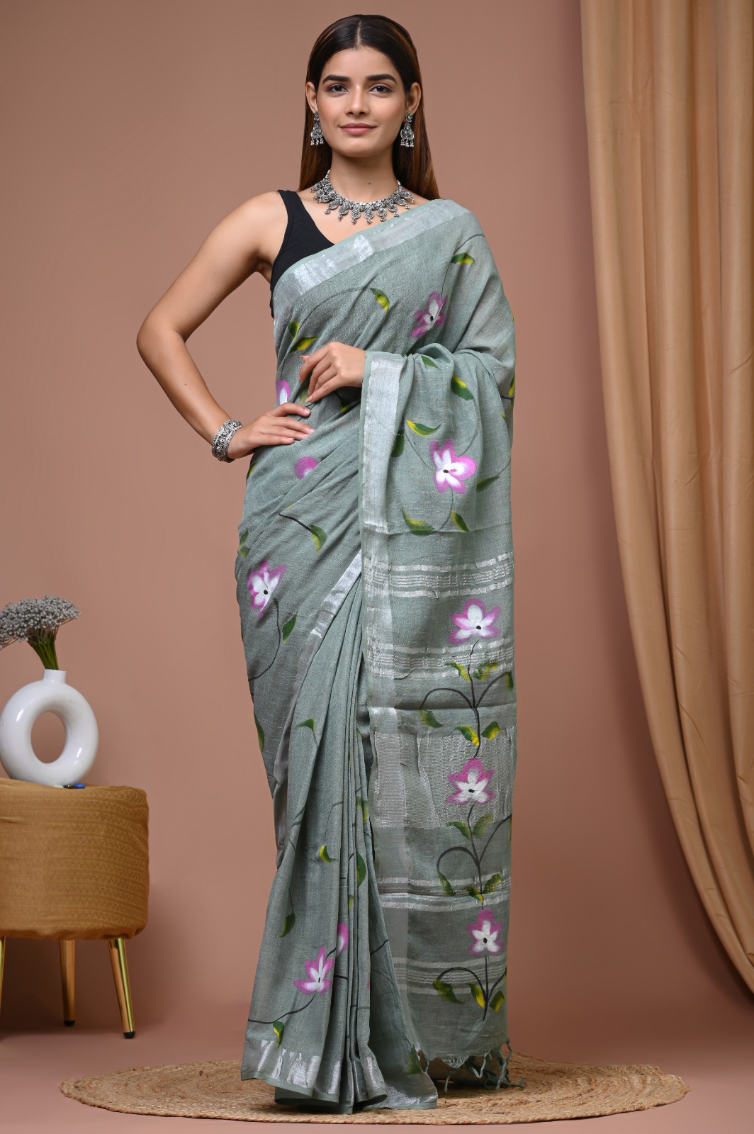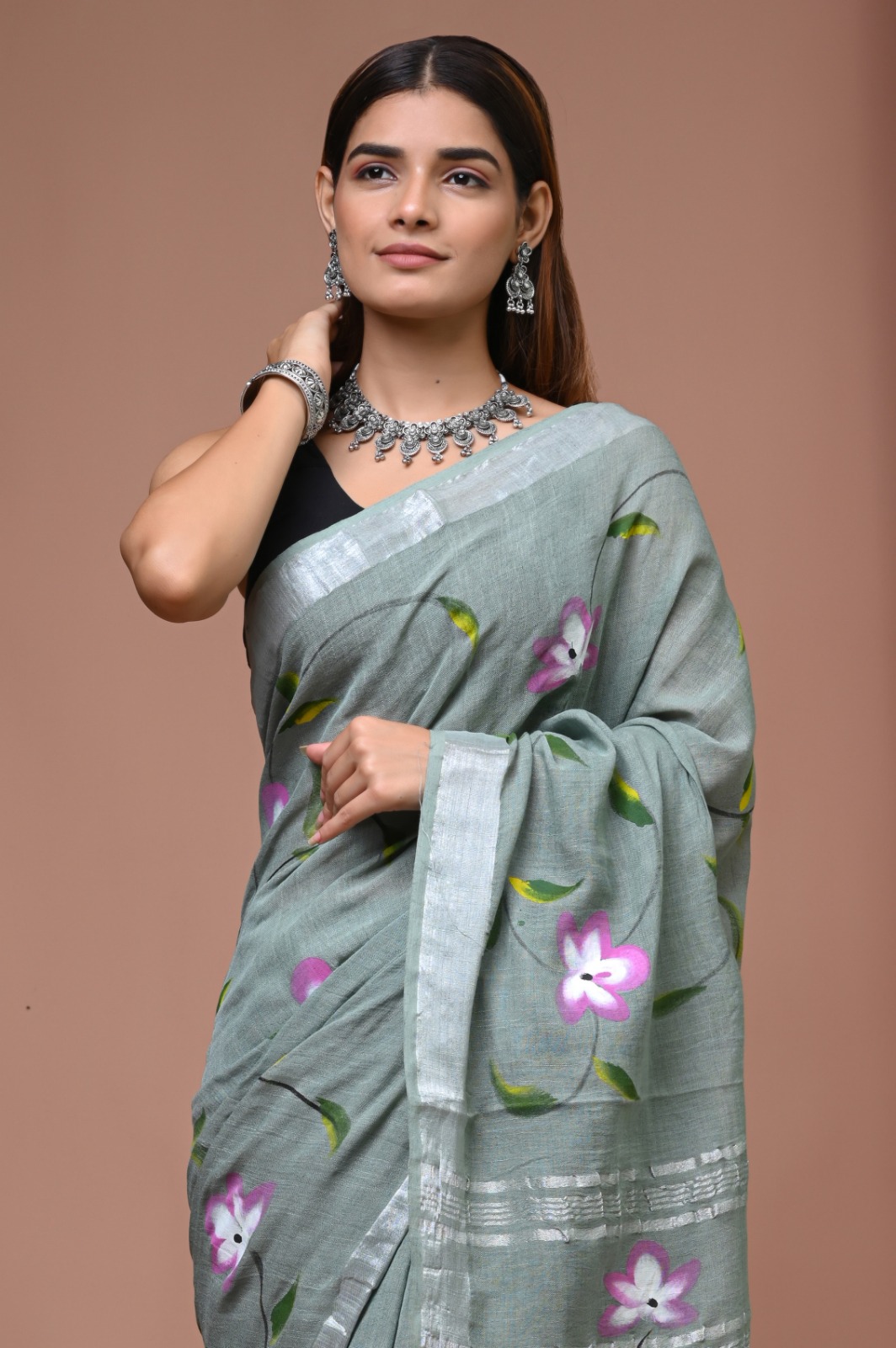 Step into a world where artistry flourishes in every fold. The Sage Floral Harmony Hand Block Printed Linen Saree celebrates the intricate craftsmanship of traditional Indian textiles. With a soft sage green base, adorned with whimsical lavender and pink blooms, this piece radiates an inviting charm.