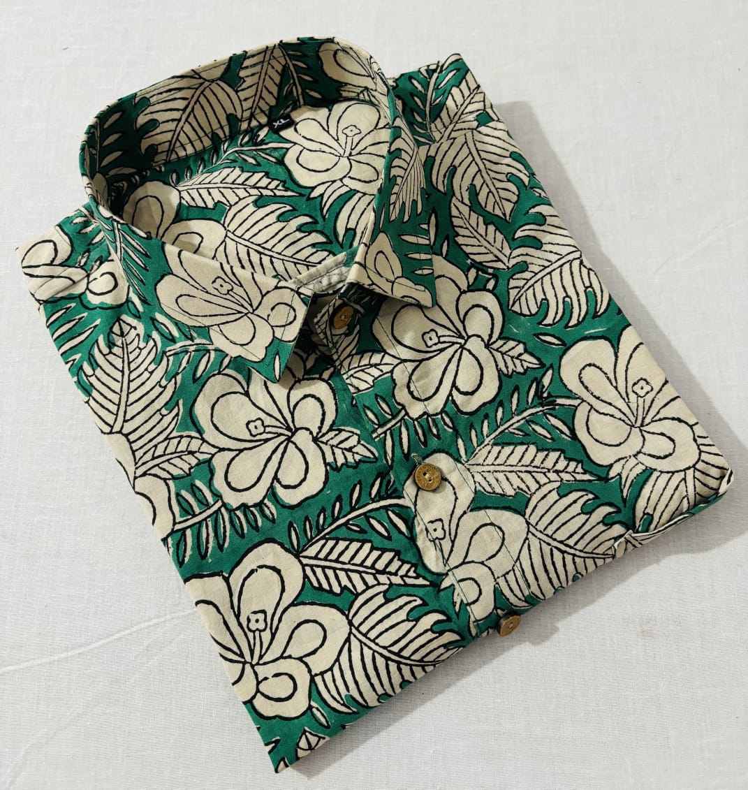 Indulge in the artisanal charm of Bagru block printing with this exquisite sage green shirt from Blockart. Crafted from premium cotton 60*60 super dying fabric, this shirt features a classic collar, wooden buttons, and a striking floral and leaf pattern outlined in black. The XL size ensures a comfortable fit for a range of body types. Elevate your wardrobe with this handcrafted piece that exudes traditional Indian craftsmanship.