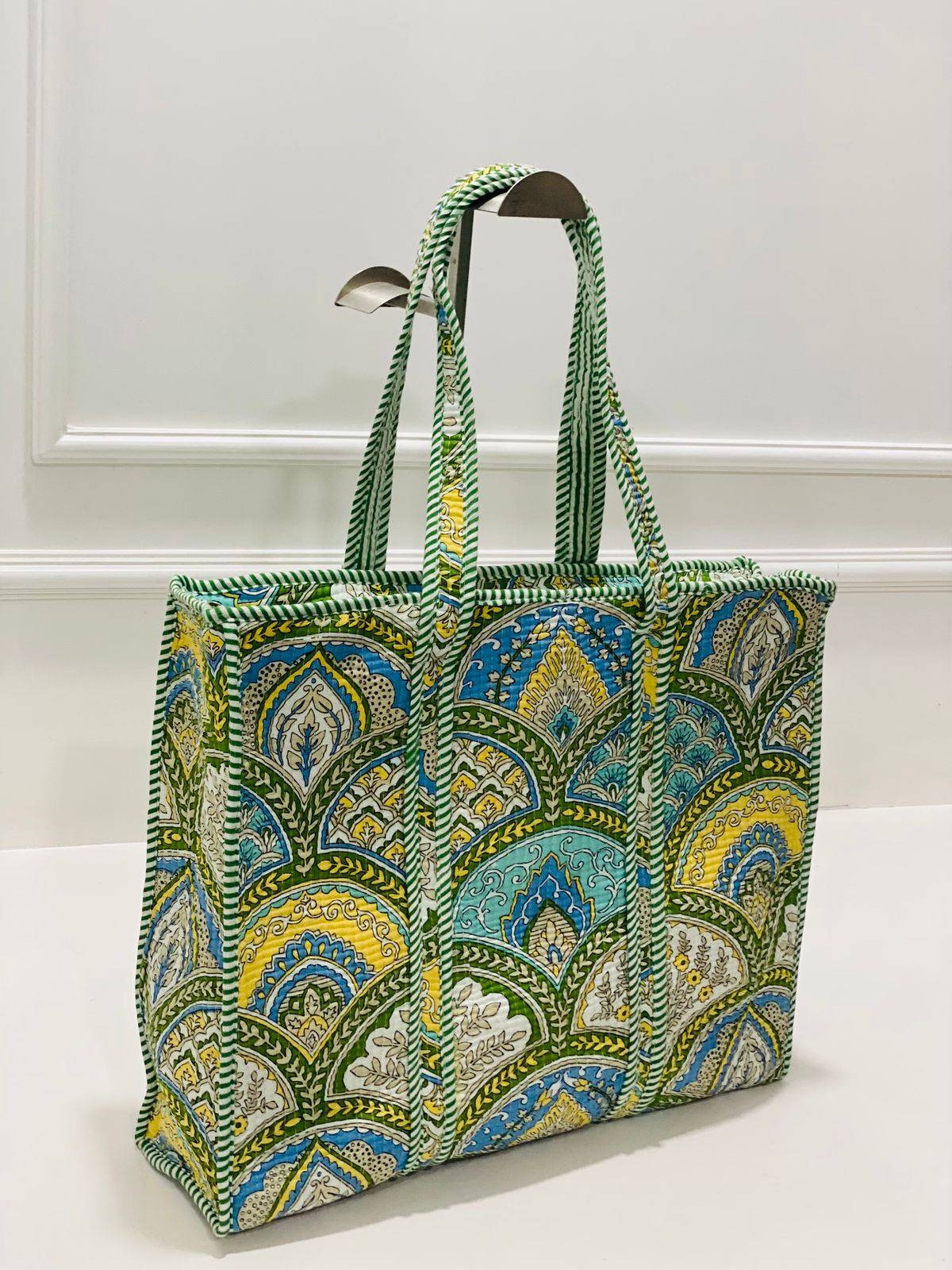 Embrace the uniqueness of this sage green tote bag adorned with intricate botanical motifs in blue, yellow, and white. The quilted cotton fabric adds texture and durability, showcasing traditional artisan techniques. The harmonious blend of colors creates a soothing visual appeal, while the striped handles provide a touch of modern flair. Practical benefits include ample space for your essentials and easy maintenance, making it a versatile and stylish accessory for any occasion. Feel a connection to the craft with each use, carrying a piece of authentic Indian tradition wherever you go.