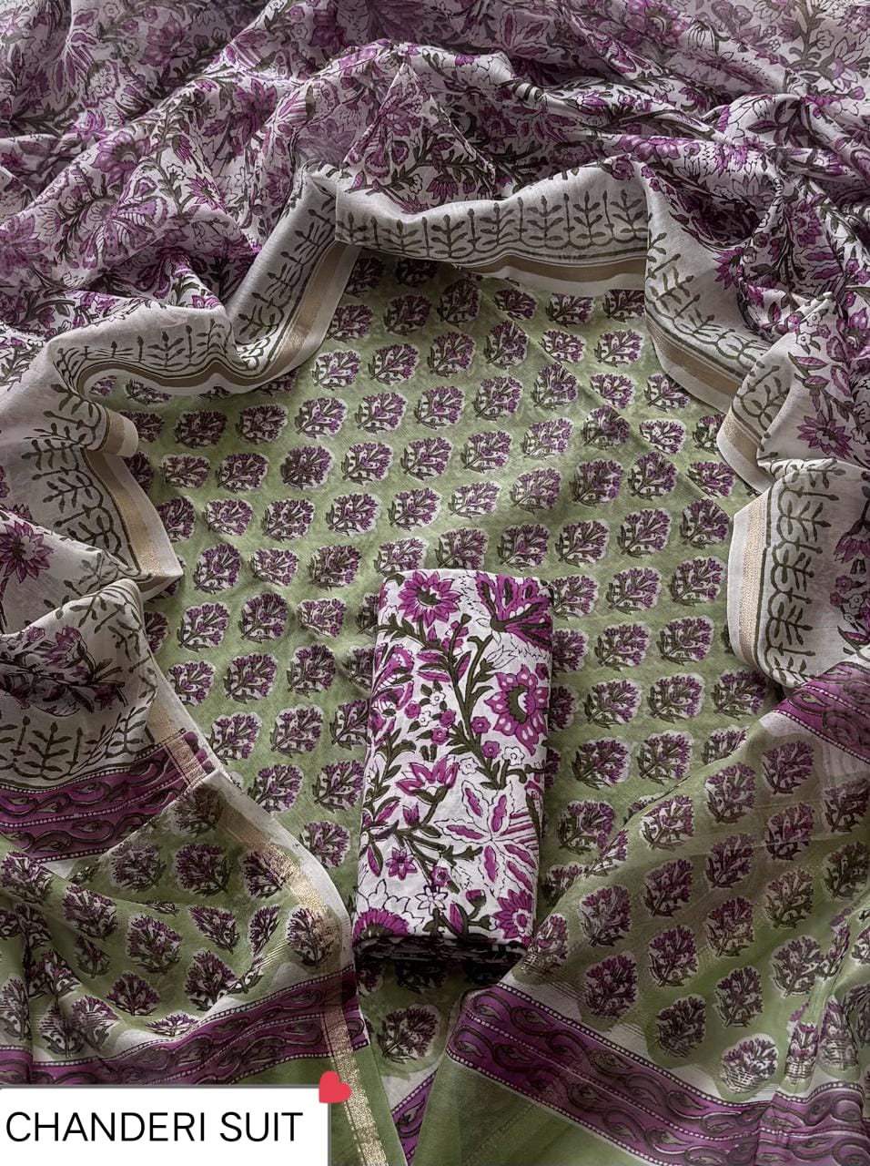 Embrace the allure of nature with the Sage Green Floral Harmony Chanderi Silk Ensemble. Delicately crafted with intricate floral block prints in shades of light green, purple, and brown, this ensemble exudes elegance and tradition. The lightweight Chanderi silk fabric enhances the intricate patterns, showcasing the skilled artisan techniques. Ideal for various occasions, this ensemble offers a blend of sophistication and cultural charm, inviting you to connect with the heritage of Indian craftsmanship.