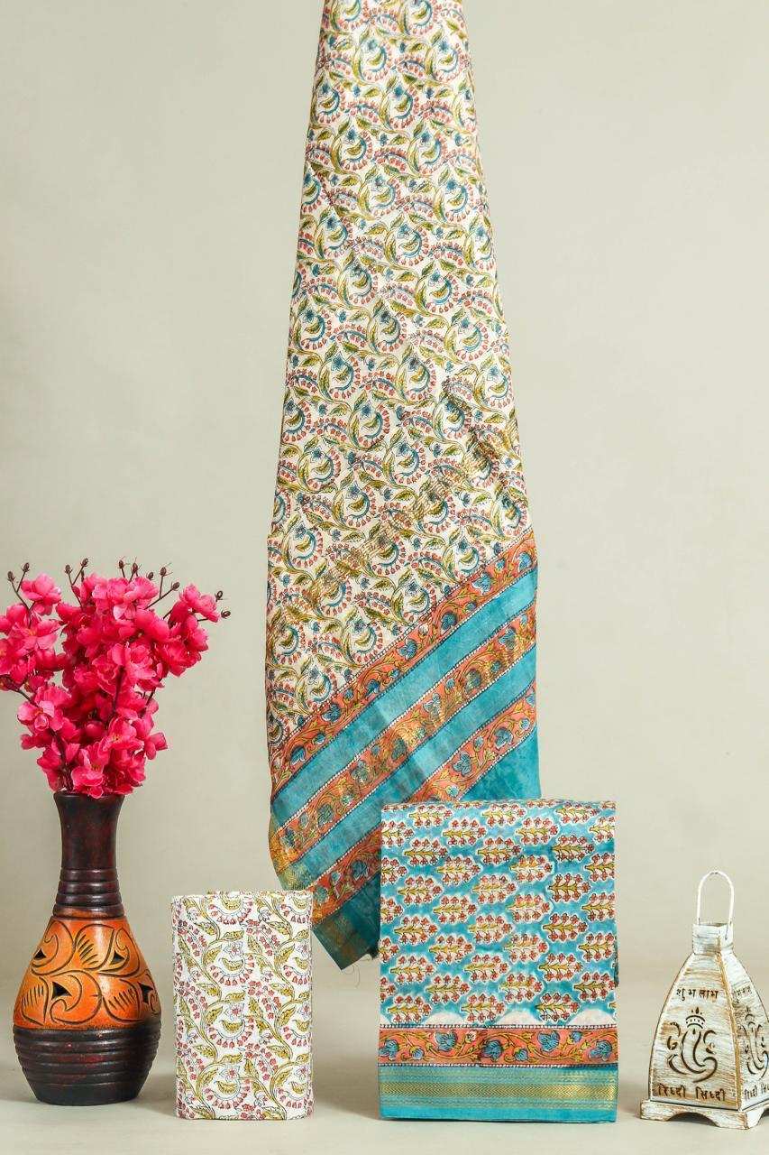 Embark on a sartorial journey with the Sage Green Paisley Cotton Maheswari Silk Ensemble by Blockart. Inspired by traditional Indian artistry, this ensemble is meticulously hand block printed on soft cotton fabric with intricate paisley patterns in shades of green, red, and blue. The fusion of Maheswari silk and cotton cambric offers a blend of luxury and comfort, ideal for various occasions. Style this ensemble in multiple ways to reflect your unique personality and heritage.