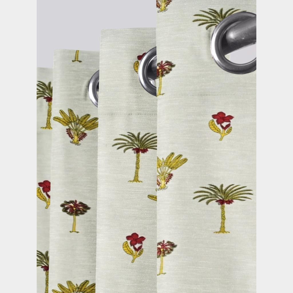 Delve into a serene oasis with our Sage Green Tropical Palm Print Cotton Curtains. Each piece is artisan-crafted, showcasing a delightful interplay of olive green palm fronds and vibrant crimson flowers against a soft sage backdrop. This design captures the essence of tropical beauty, effortlessly bringing a touch of nature into your home.