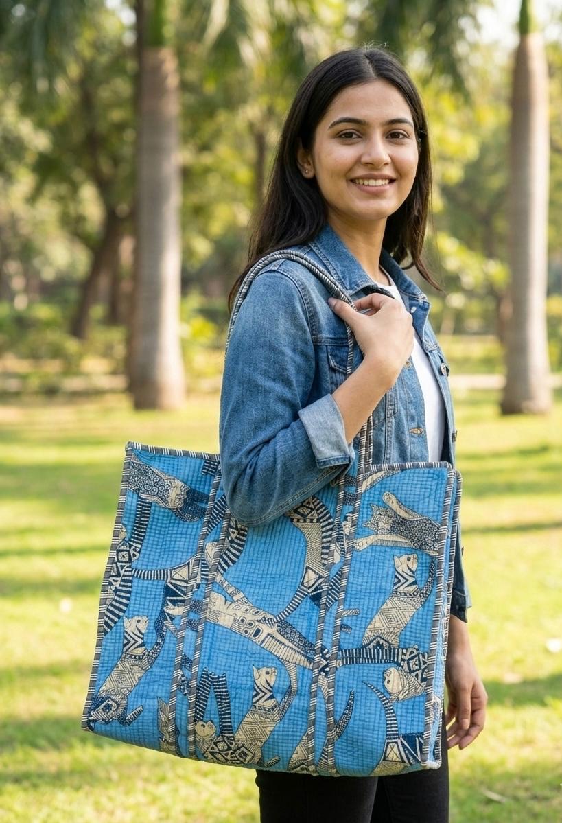 Step into a world of ethnic charm with our Sapphire Serenity Quilted Cotton Tote Bag. This spacious, artisan-crafted bag showcases a captivating design of abstract animal motifs in beige and black on a serene blue backdrop. The quilted cotton fabric provides a soft, comforting feel, making it a joy to carry. Each piece is meticulously handcrafted by skilled artisans, ensuring a unique touch to your ensemble.