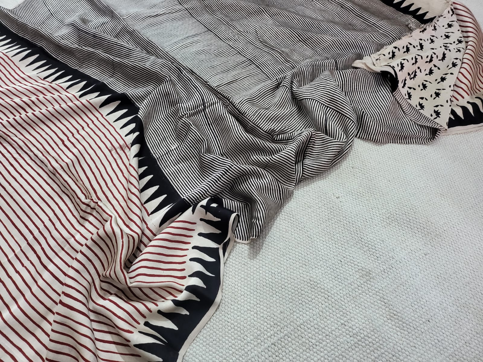 Discover the artisan's inspiration woven into the Scarlet Charm Hand Block Modal Silk Saree. Crafted with intricate hand block printing, this saree showcases a striking mix of colors - black, white, and red - in fine stripes, bold zigzag patterns, and delicate motifs. The lightweight and soft Modal Silk fabric drapes elegantly, offering versatility in styling for various occasions. Embrace the cultural heritage reflected in every thread of this exquisite piece.