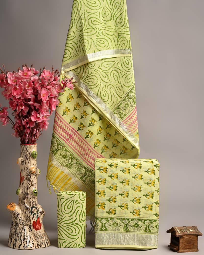 Elevate your ethnic wardrobe with this exquisite handcrafted linen cotton suit set from Blockart. The set includes a top, dupatta, and bottom featuring intricate Bagru hand block prints. Made from lightweight, breathable fabrics, this set offers comfort and style. The silver border on the dupatta adds a touch of elegance, making it a perfect choice for summer occasions.