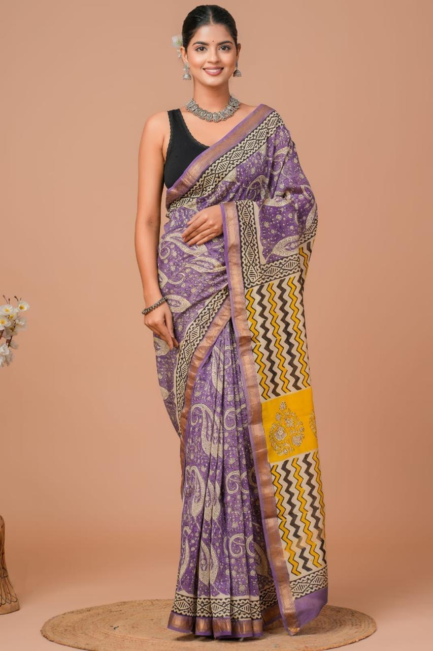 Each intricate paisley and floral pattern on the purple canvas is a testament to our artisanal heritage, meticulously hand block printed by skilled craftsmen. The pallu boasts mesmerizing zigzag designs in black, cream, and yellow, accentuated by delicate floral embroidery on a radiant yellow patch.