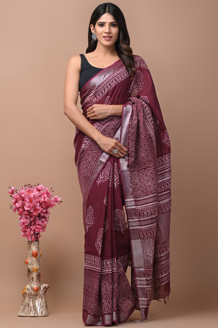 Elevate your ethnic wardrobe with our exquisite Silver Border Maroon Floral Hand Block Printed Linen Saree. Crafted with care, this saree features intricate floral patterns and a shimmering silver border, adding a touch of elegance to your look. Made from premium linen fabric, this saree drapes beautifully and ensures comfort all day long. Embrace the artistry of hand block printing with this timeless piece that exudes traditional charm.