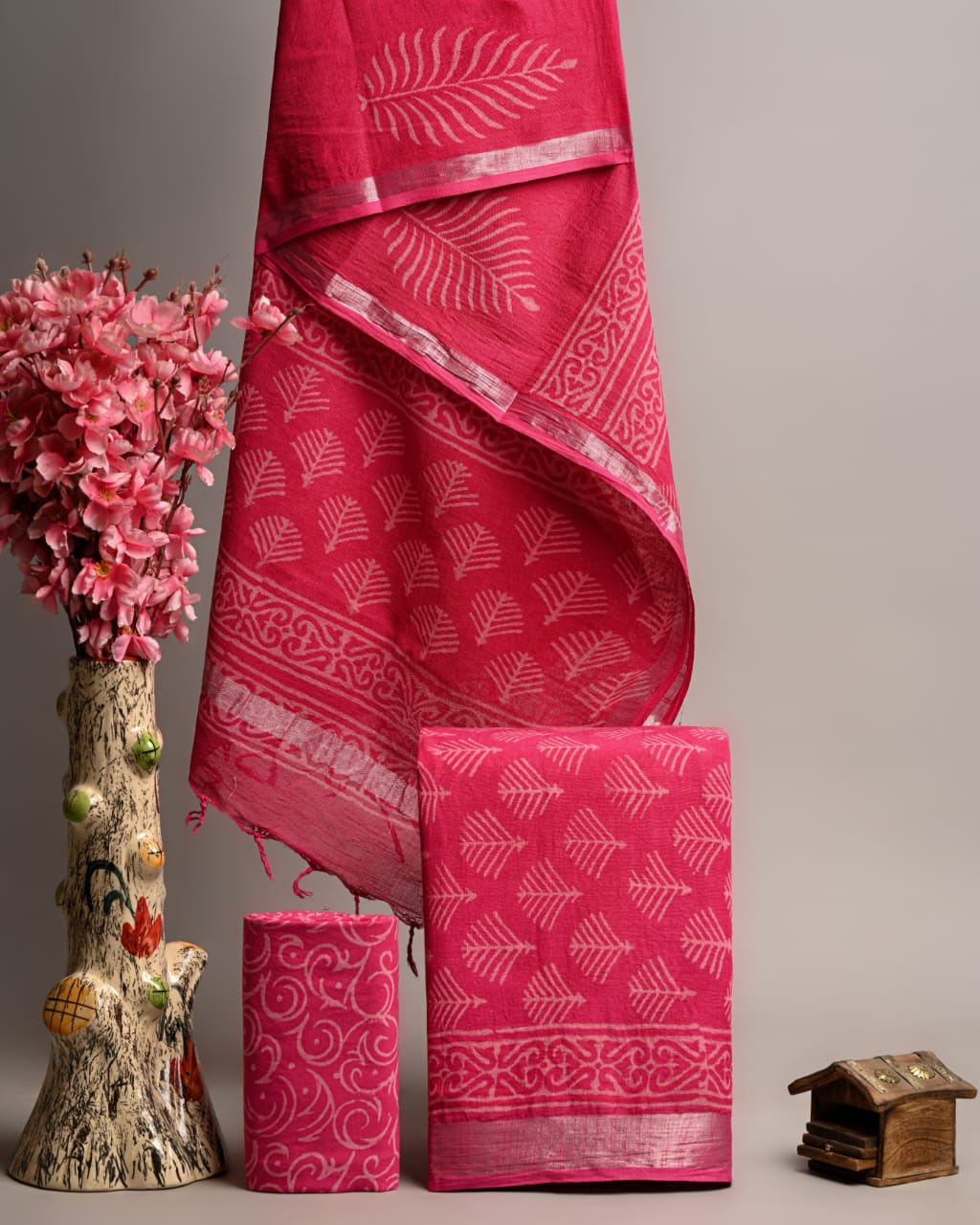 Indulge in the elegance of Bagru hand block printed linen suits with exquisite silver borders. Crafted from premium linen cotton fabric, this set includes a top, dupatta, and bottom piece, each showcasing intricate leaf motifs, ornamental borders, and a blend of traditional Indian craftsmanship. The breathable and comfortable fabric ensures a luxurious feel, perfect for ethnic occasions and everyday wear.
