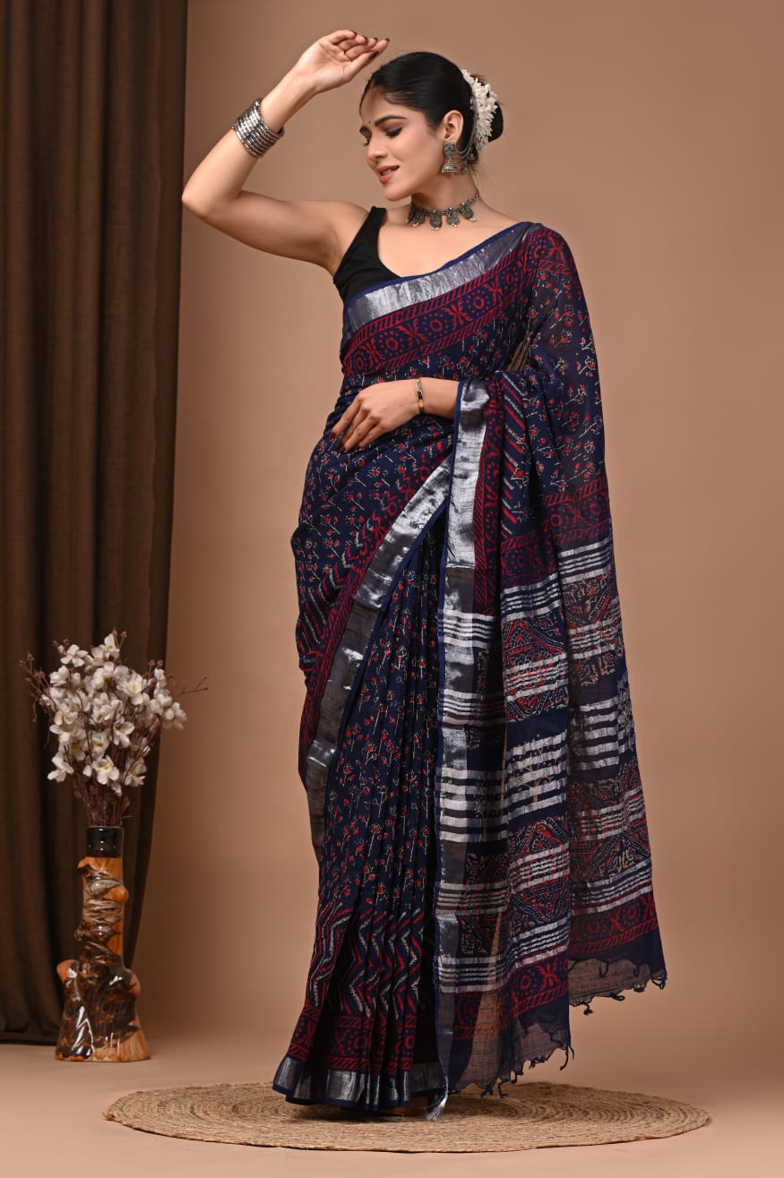 Elevate your ethnic wardrobe with this exquisite hand block printed linen saree from Blockart. Crafted with precision, this saree features intricate red and silver floral and geometric patterns, exuding traditional charm. The silver metallic border adds a touch of elegance to the overall look. The lightweight fabric ensures comfort all day long, making it perfect for festive occasions and celebrations. Embrace the artistry of Indian craftsmanship with this premium linen saree.