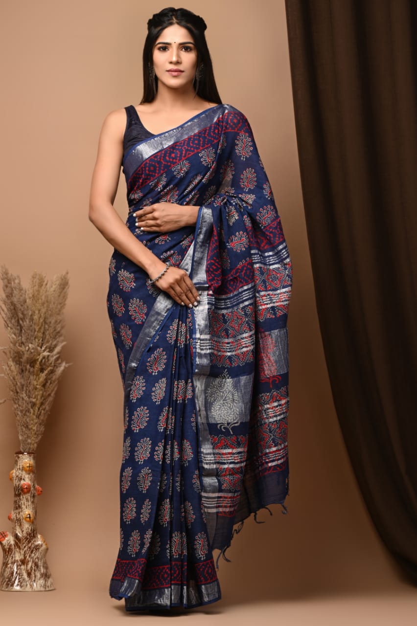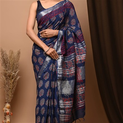 Experience the elegance of hand block printing combined with the comfort of premium fabric. The silver border and detailed pallu add a touch of sophistication to this timeless piece. Embrace the rich cultural heritage of India with this stunning saree.