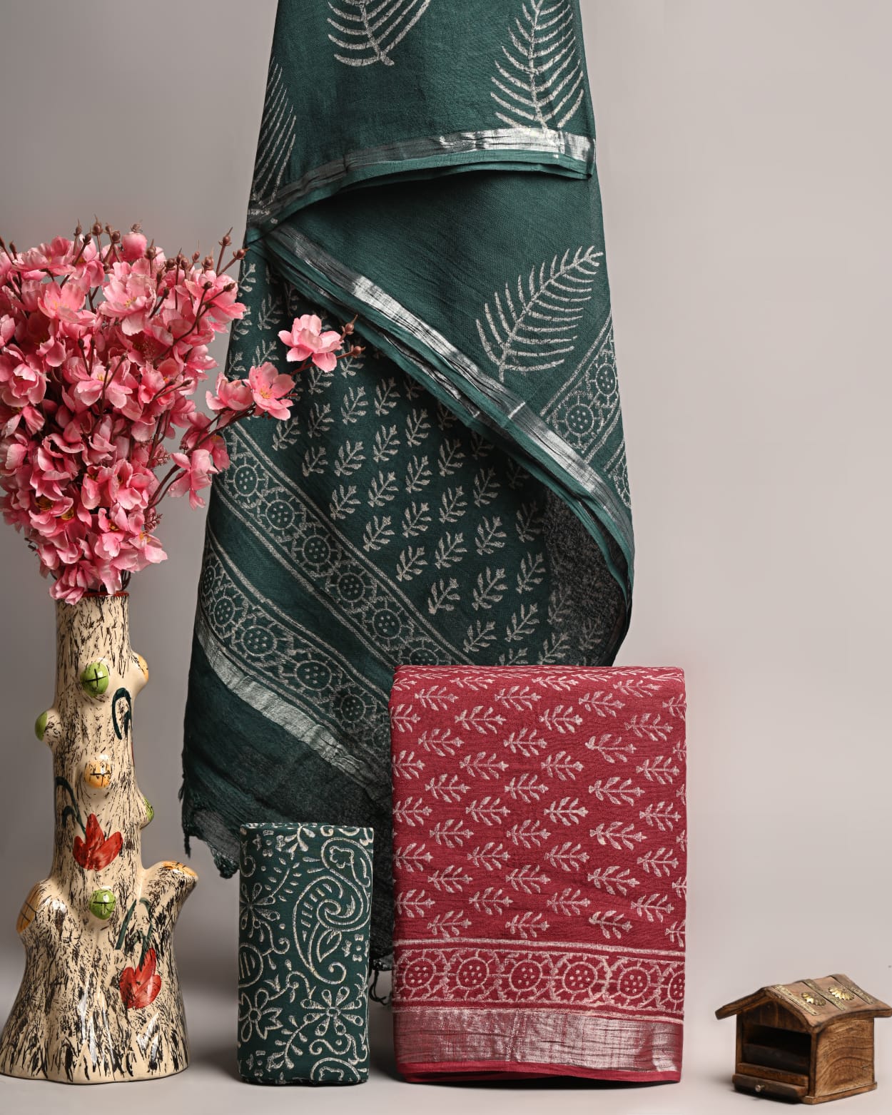 Elevate your ethnic wardrobe with this exquisite Bagru Hand Block Printed Linen Suits Set. Crafted from premium Linen Cotton fabric, this set features intricate silver leaf motifs that exude elegance. The breathable and comfortable fabric ensures a luxurious feel, making it perfect for all occasions. Embrace the artistry of hand block printing with this artisanal creation.