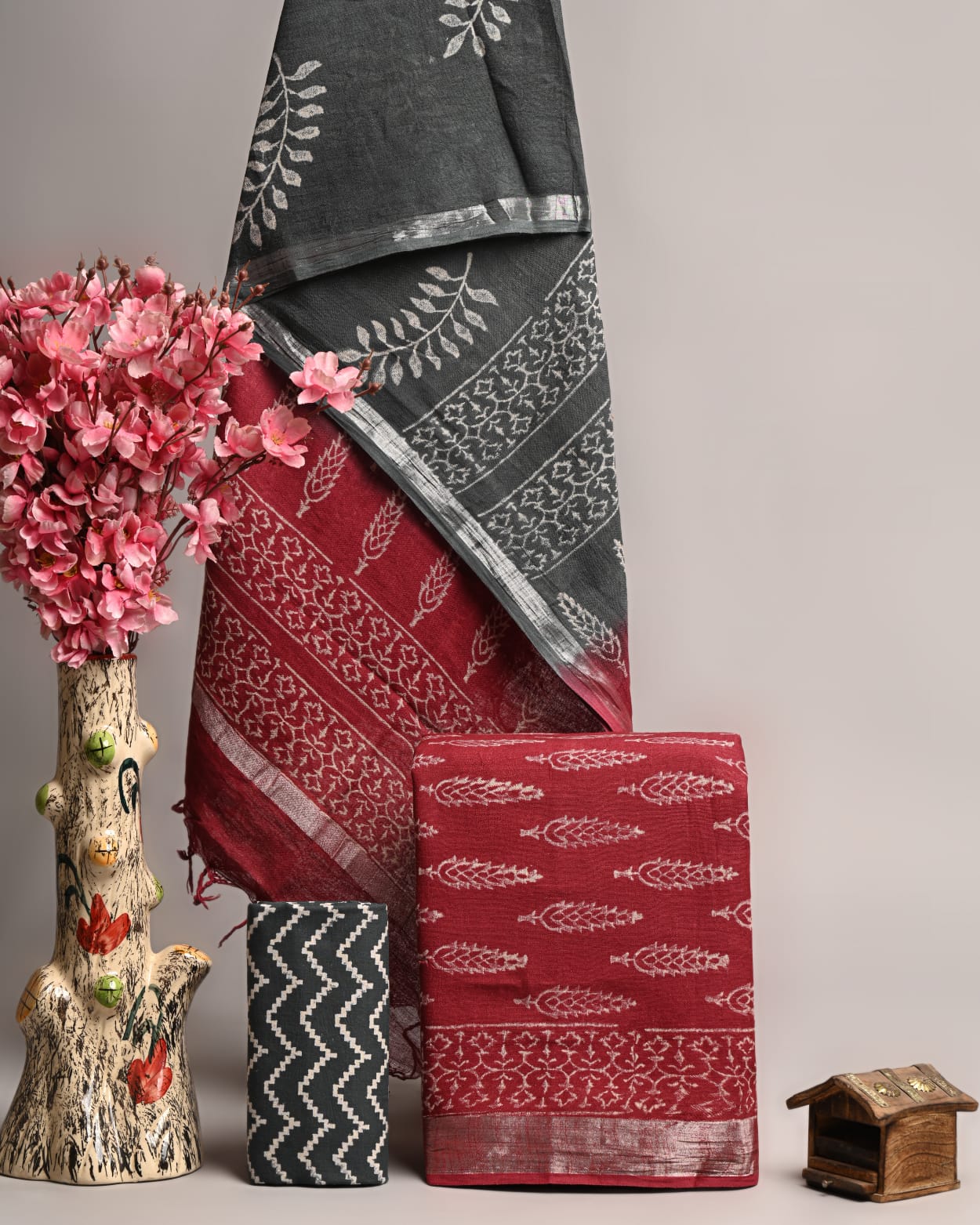Elevate your ethnic wardrobe with this exquisite handcrafted set from Blockart. The top features a stunning silver leaf and vine pattern, crafted on high-quality Linen Cotton fabric. Paired with a vibrant red dupatta adorned with intricate floral motifs, this set exudes traditional charm and artisanal elegance. The cotton bottom piece ensures comfort and style. Embrace the artistry of Bagru hand block printing with this premium ensemble.