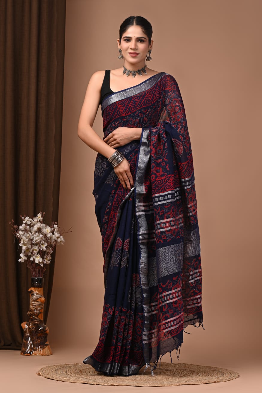 Embrace the timeless elegance of hand block printing with our exquisite Silver Sheen Floral Navy Linen Saree. Crafted from premium lightweight linen fabric, this saree features intricate floral and geometric motifs in striking red and silver hues. The shiny silver border adds a touch of sophistication, while the pallu showcases a mix of stripes and detailed designs. Experience comfort, style, and craftsmanship in every drape.