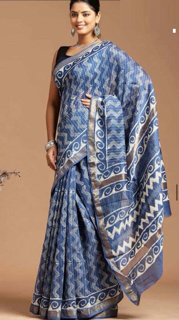 Wrap yourself in elegance with our Silver Swirl Maheshwari Silk Saree, a masterpiece of traditional Indian craftsmanship. The soft silk fabric drapes luxuriously, offering a tactile experience like no other. Each intricate swirl and geometric pattern is meticulously hand block printed, a testament to the skilled artisans behind this creation.