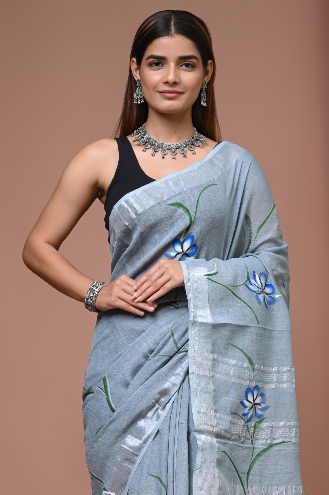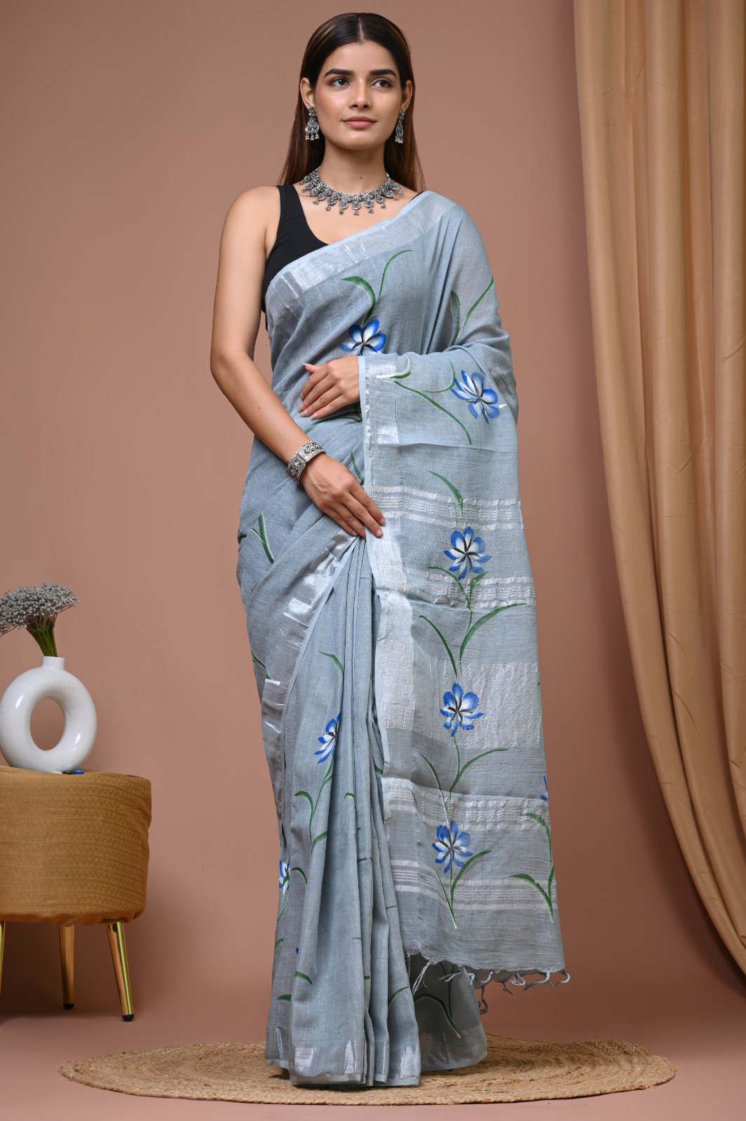 In a soothing light blue hue, the Sky Blooms Floral Print Linen Saree is a harmonious blend of nature’s beauty and artisan skill. Adorned with elegant floral motifs in cerulean and black, this piece evokes a sense of serene sophistication. The flowing drape of the fabric enhances its lightweight charm, making it a delightful choice for various occasions.