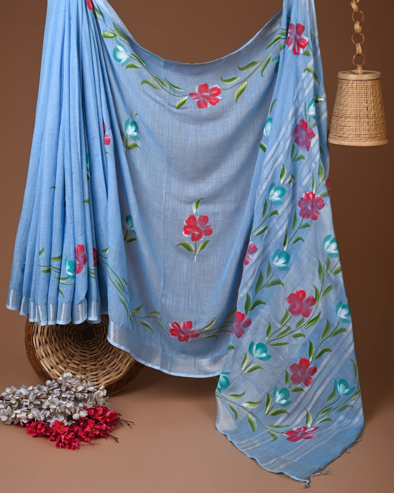 Immerse yourself in a tapestry of colors with this enchanting sky blue saree. Adorned with vibrant crimson blooms and delicate teal accents, it captures the essence of spring and the beauty of nature. The flowing fabric drapes gracefully, offering a light and airy feel that’s perfect for sunny days and festive gatherings. Crafted using traditional hand block printing techniques, each piece showcases the unique artistry of Indian craftsmanship.