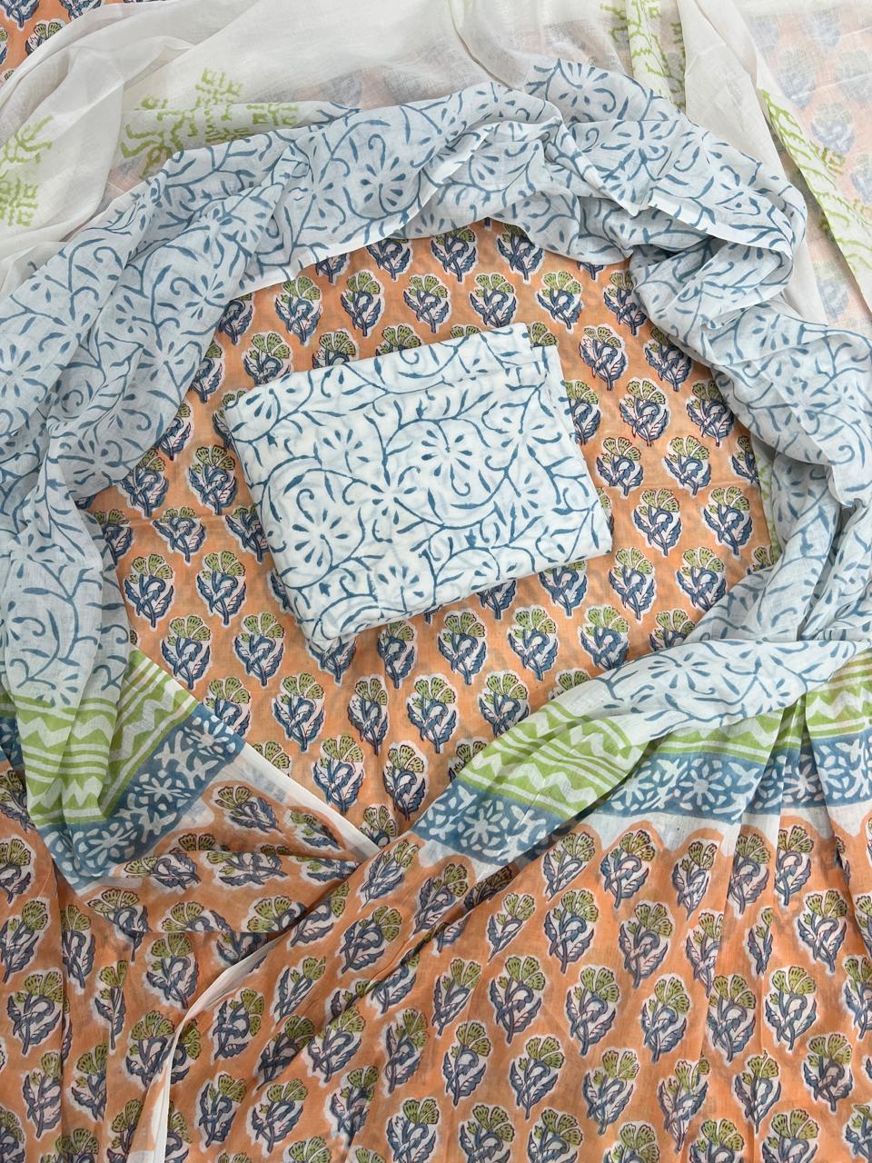 Immerse yourself in the vibrant artistry of our Sky Blue Floral Whimsy Cotton Dress Material. This exquisite 3-piece set captures the essence of traditional hand block printing, infusing your wardrobe with a splash of character and elegance. Crafted from 100% pure cotton, each piece ensures breathability and comfort, making it an exceptional choice for both everyday wear and special occasions.