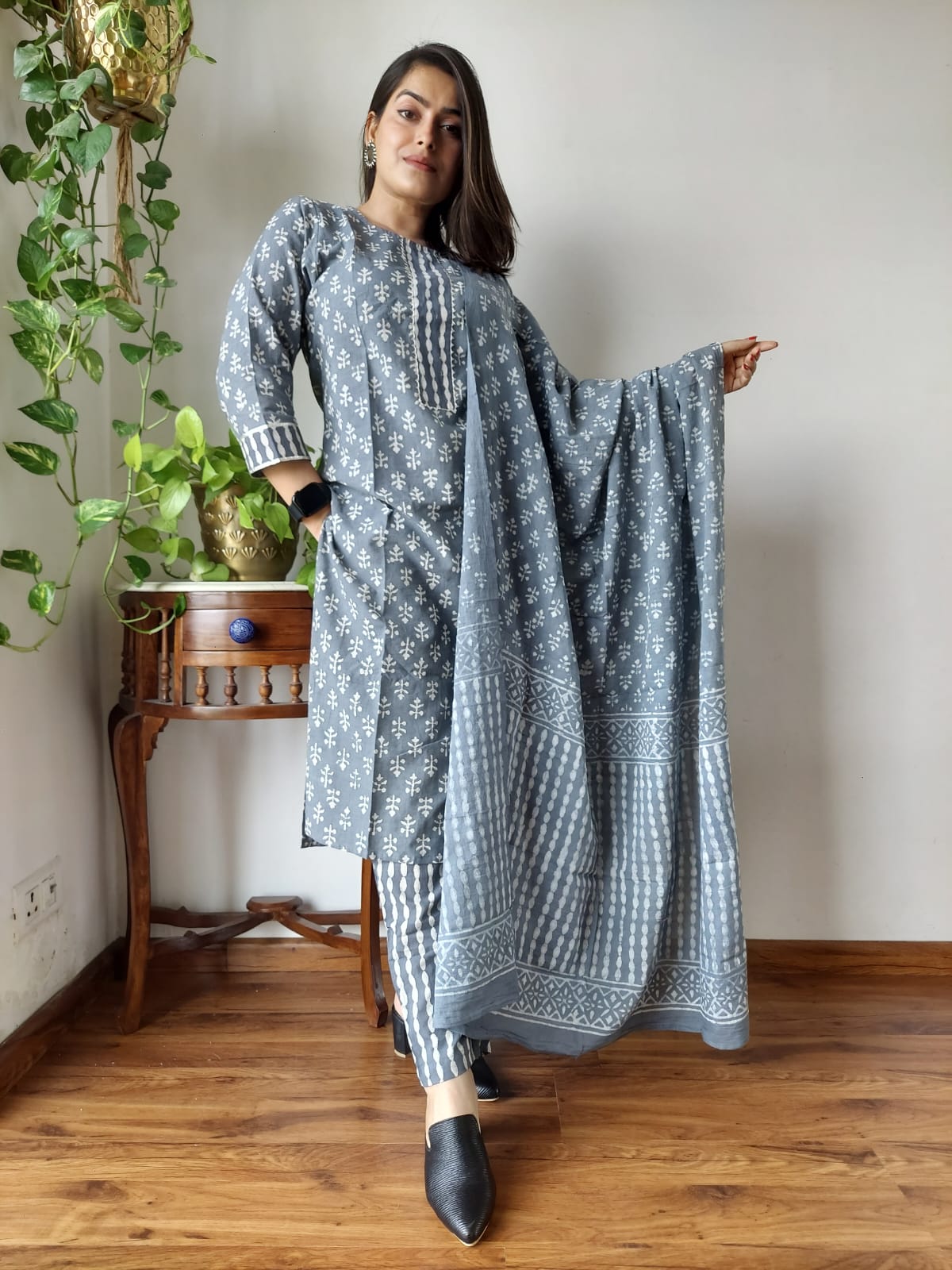 Step into a world of serene elegance with the Slate Blue Floral Harmony Cotton Suit Set, a beautifully crafted ensemble that seamlessly blends tradition with contemporary style. Adorned with delicate floral and geometric motifs, this suit set tells a story of artisanal excellence, showcasing the beauty of hand block printing.