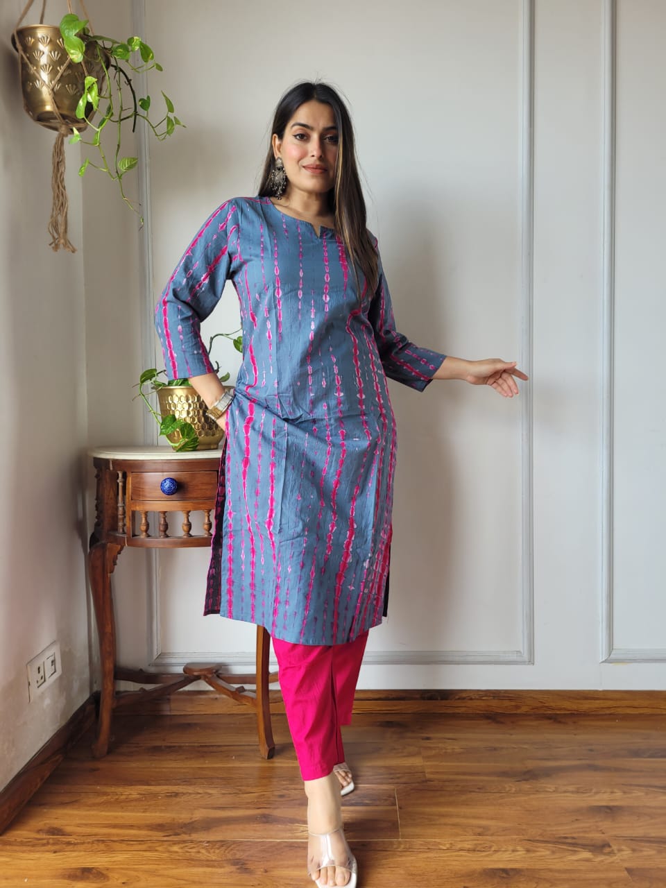 Drape yourself in the soft embrace of our Slate Blue Fuchsia Stripe ensemble, where playful stripes dance across a breathable cotton canvas. This carefully made outfit captures the spirit of Indian craftsmanship, with artisan-inspired prints that evoke a sense of joy and celebration.