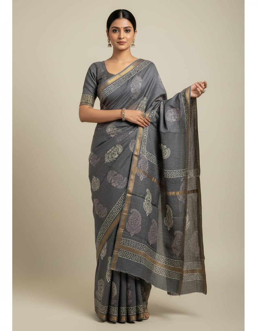 Immerse yourself in the artistry of our Slate Gray Floral & Geometric Maheshwari Silk Saree, a testament to the rich heritage of Indian craftsmanship. This exquisite piece showcases a harmonious blend of intricate floral and paisley motifs, gracefully framed by a striking geometric border. Each detail is a whisper of tradition, yet it resonates with a modern sensibility.