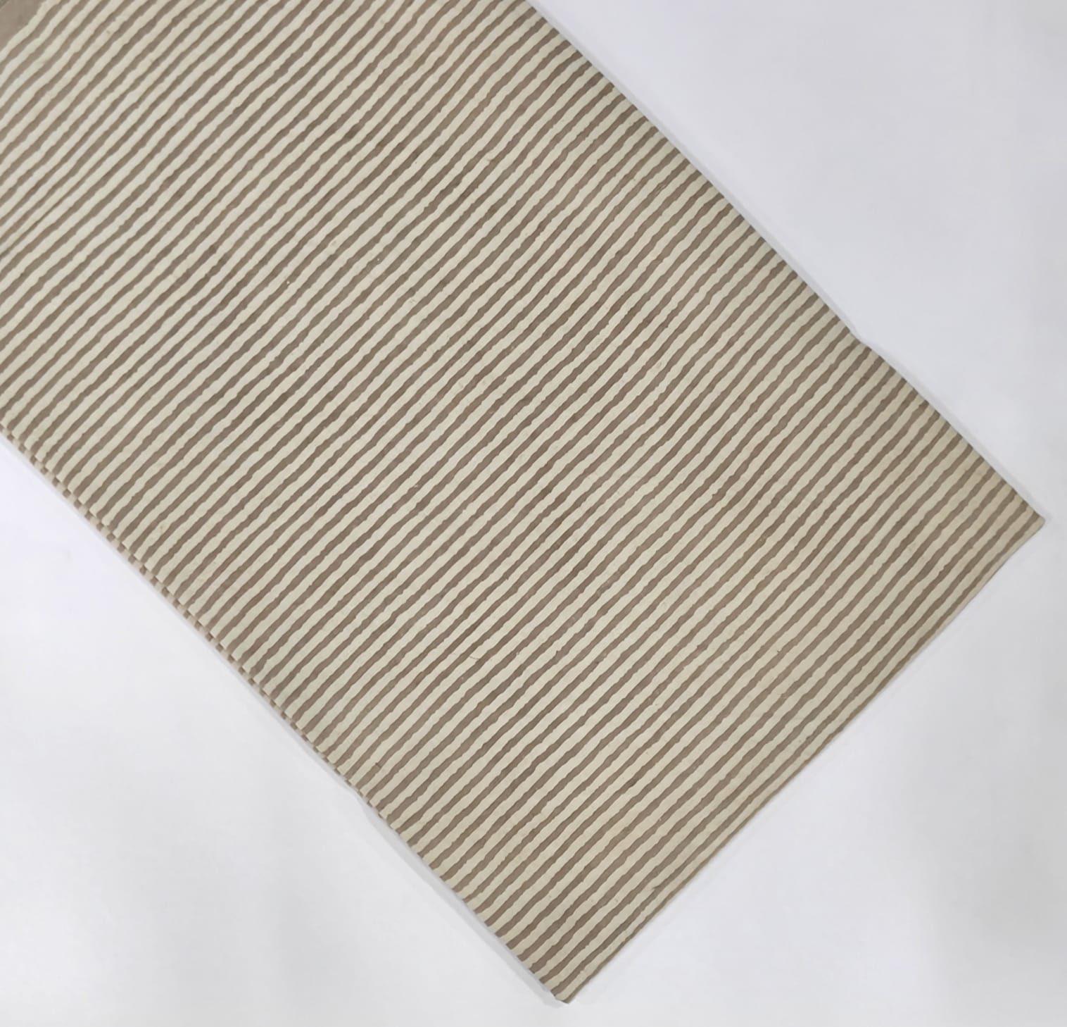 Let the warmth of artisanal craftsmanship envelop you with our Soft Beige Striped Dabu Cotton Running Fabric. This exceptional fabric features subtle stripes that create a harmonious blend of simplicity and elegance, perfect for a variety of projects.