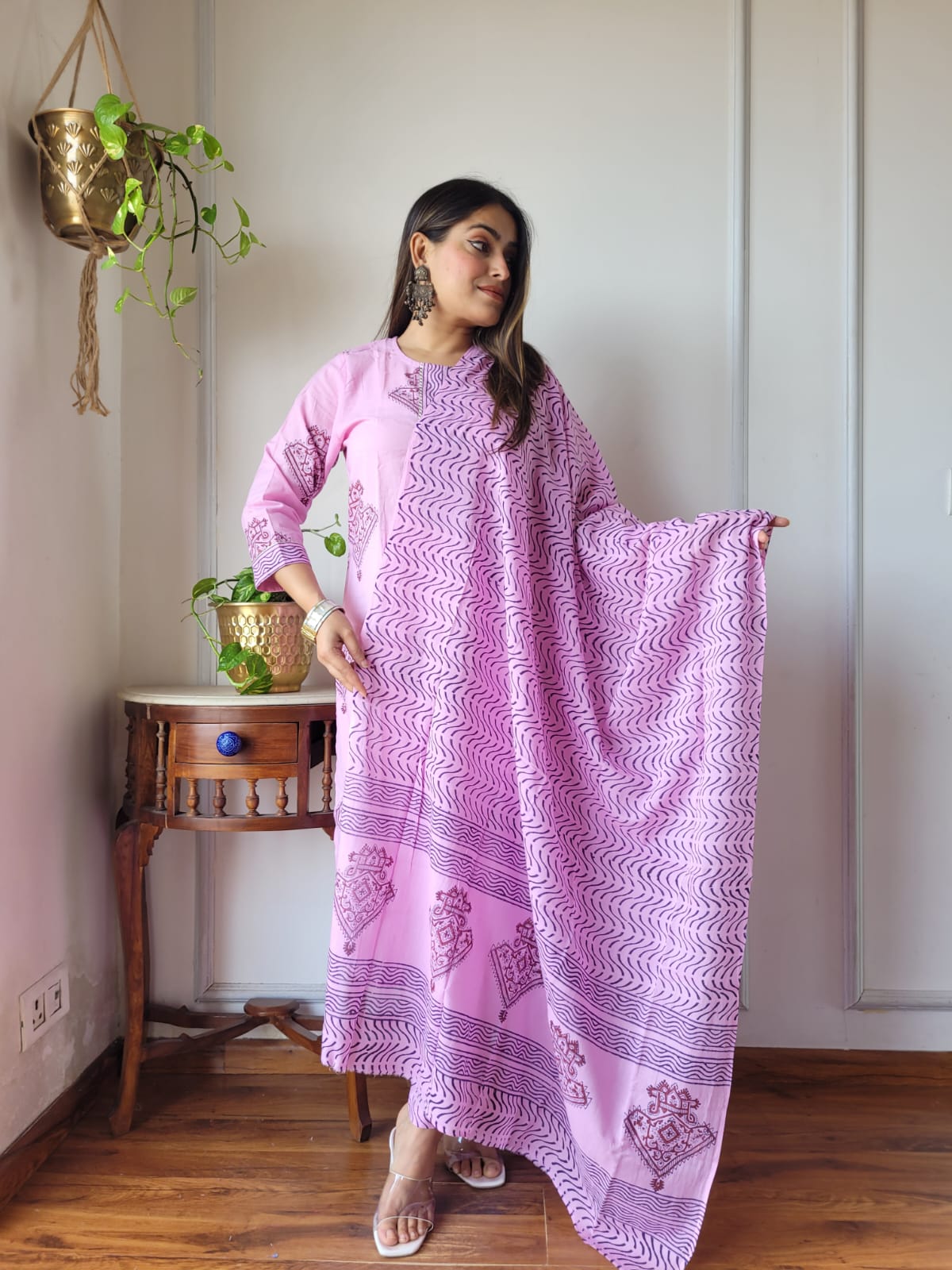 Finding the right blend of comfort and style can be a challenge. This artisan-crafted suit set offers a refreshing solution with its soft pink hue and intricate zigzag motifs. Made from breathable cotton, it’s designed to keep you feeling light and airy, making it a wonderful choice for both daily wear and special occasions.