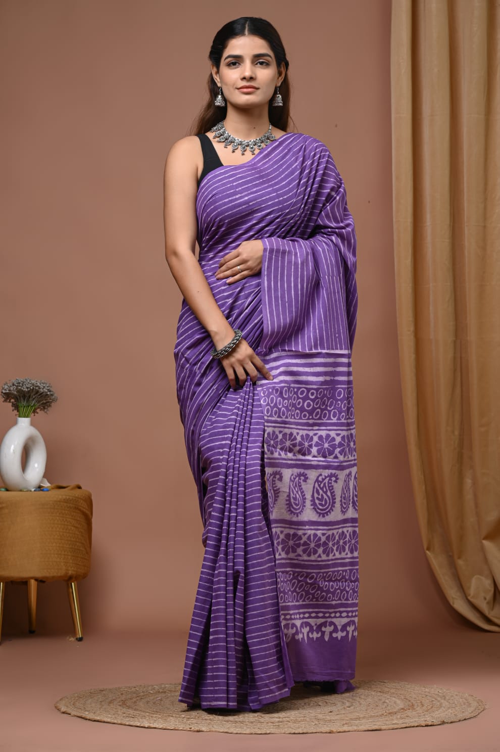 Elevate your ethnic wardrobe with our exquisite Striped Lavender Paisley Mulmul Saree. Crafted from premium mulmul cotton, this saree features intricate hand block printing and a blend of stripes and traditional paisley motifs on the pallu. The lightweight fabric ensures comfort for all-day wear. Perfect for cultural events or casual gatherings.