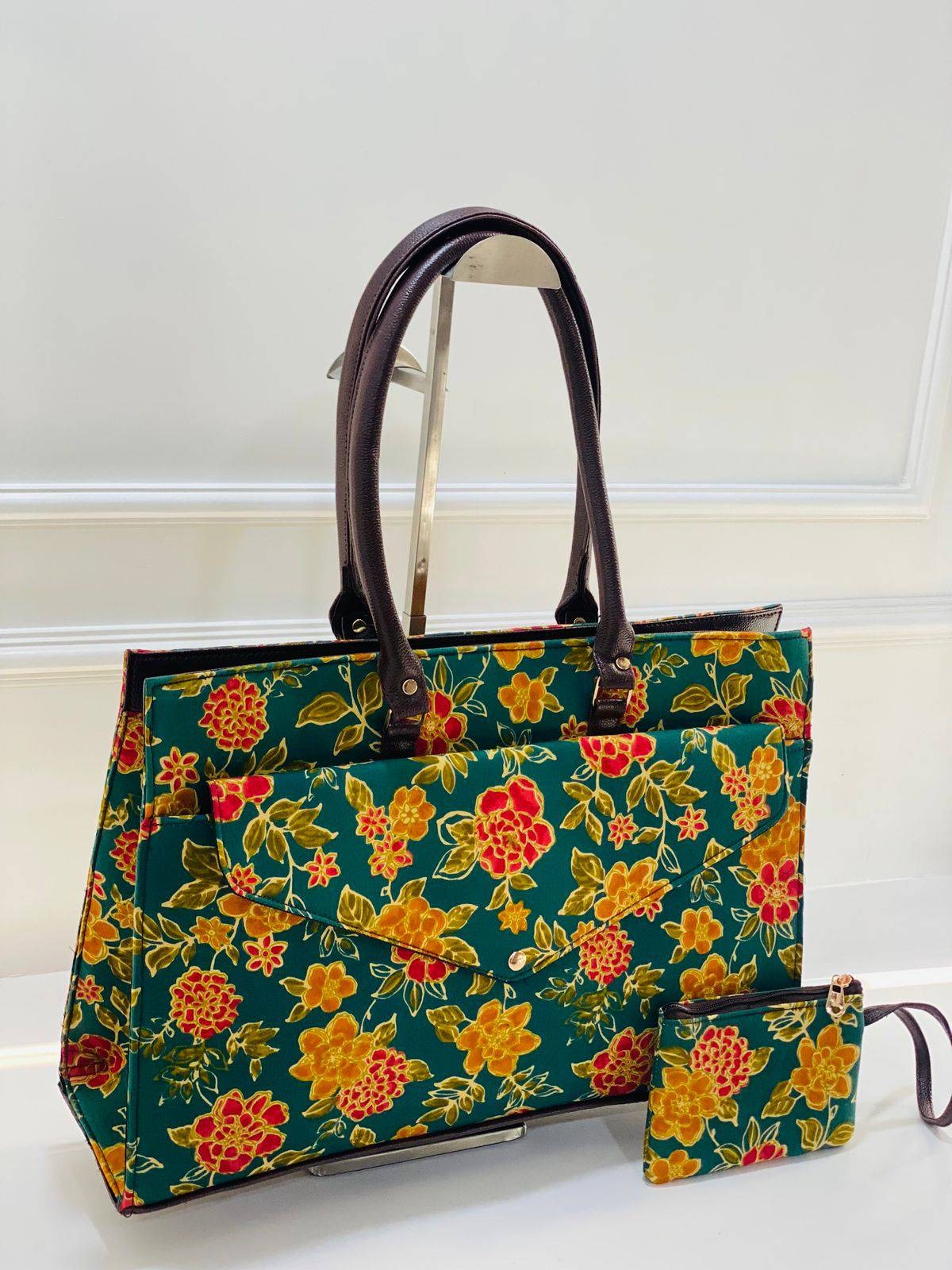 Embrace the vibrant charm of the Sunburst Floral Tapestry Cotton Bag and Pouch Set, a delightful ensemble that exudes elegance and sophistication. The main body features a mesmerizing floral pattern in shades of yellow, orange, and red against a deep teal backdrop, complemented by dark brown leather handles. Crafted from premium cotton fabric, this set includes a spacious bag with multiple compartments and a handy pouch for your essentials. The bag boasts a front pocket with a gold button closure and a dedicated laptop partition, while the pouch offers a zip closure and a convenient wrist strap. Experience the luxurious comfort and quality of these artisan-crafted pieces, ideal for various occasions from casual outings to work settings. To care for these treasures, gently hand wash in cold water and air dry to maintain their pristine condition. Elevate your everyday style with the unique charm of this Sunburst Floral Tapestry set.