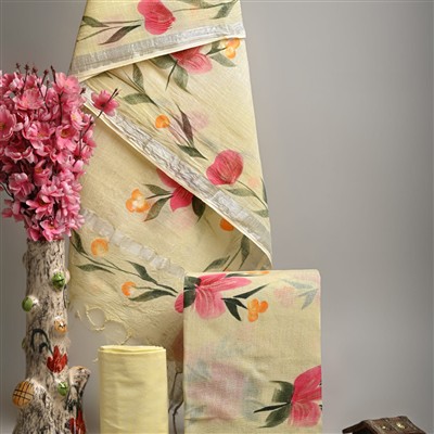 Elevate your ethnic wardrobe with this exquisite linen cotton suit set from Blockart. Handcrafted using Bagru hand block printing, this set features a stunning sunflower bloom print in shades of pink, red, orange, and green. The silver border detailing adds a touch of elegance to the ensemble. Made from lightweight and breathable fabrics, this set ensures comfort without compromising on style. Embrace traditional Indian craftsmanship with this premium suit set.