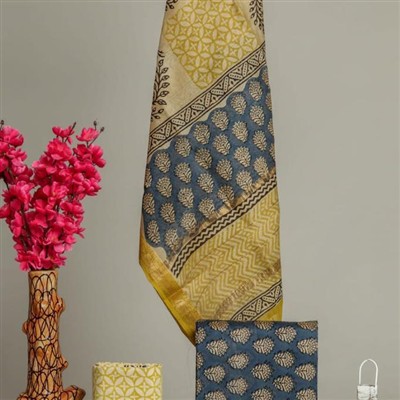 Step into a world of elegance with our Sunflower Fields Geometric Maheshwari Silk Ensemble. The fabric features a harmonious blend of muted yellow, cream, and blue tones, adorned with geometric and floral patterns that evoke a sense of traditional charm. Crafted from luxurious Maheshwari silk, this ensemble offers a soft, lightweight feel and drapes beautifully on the body, ensuring lasting comfort throughout the day. Whether you're attending a festive celebration or a special occasion, this ensemble is ideal for adding a touch of sophistication to your look. Carefully crafted by skilled artisans, each piece showcases intricate block print designs and exquisite detailing, making it a true work of art. Pair it with minimal jewelry and sandals for a refined, cultural appeal.