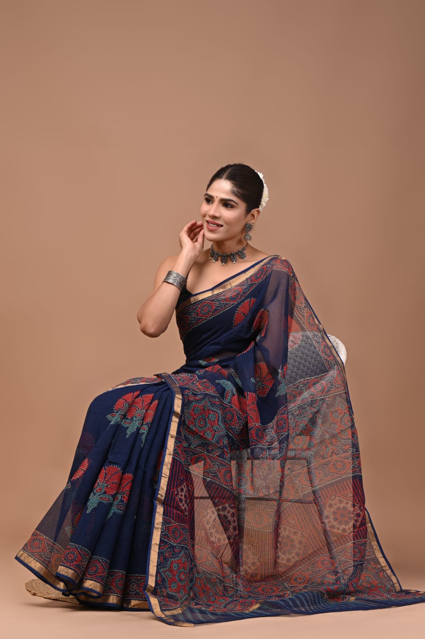 Envelop yourself in a gentle embrace of tradition with our Sunkissed Terracotta Floral Kota Doria Saree. The fabric, pure Kota Doria, whispers sophistication and charm, as it flows gracefully around you. With a soft, breathable cotton body, this saree is perfect for warm days, allowing you to move comfortably while celebrating the artistry of intricate, multi-color hand block prints.