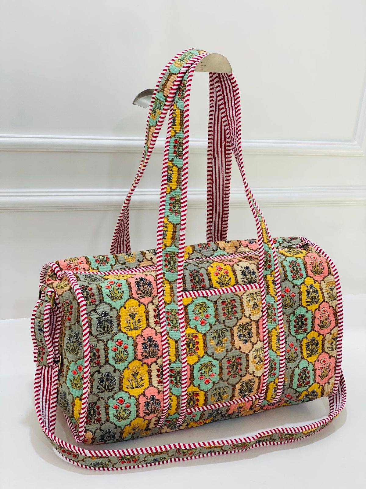 Step into the world of vibrant artistry with the Sunlit Floral Splendor Quilted Cotton Duffle Bag. This unique piece showcases a multicolored floral pattern in shades of yellow, pink, turquoise, beige, and gray, complemented by red and white striped accents. The meticulous hand block printing techniques bring out the rich cultural heritage of Indian textiles, offering a blend of tradition and modern style.