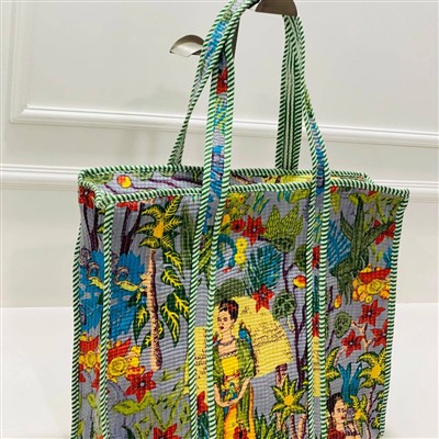Step into a world of vibrant artistry with our Sunny Fields Quilted Cotton Tote Bag. The multicolored design on a light gray backdrop bursts with energy, showcasing intricate illustrations of people, plants, flowers, and animals. The padded quilted fabric adds texture and durability, ensuring lasting wear. Whether you're heading to a casual outing or an artistic event, this medium to large-sized bag offers ample space for your essentials. Pair it with your favorite casual or artsy outfits for a touch of cultural charm.