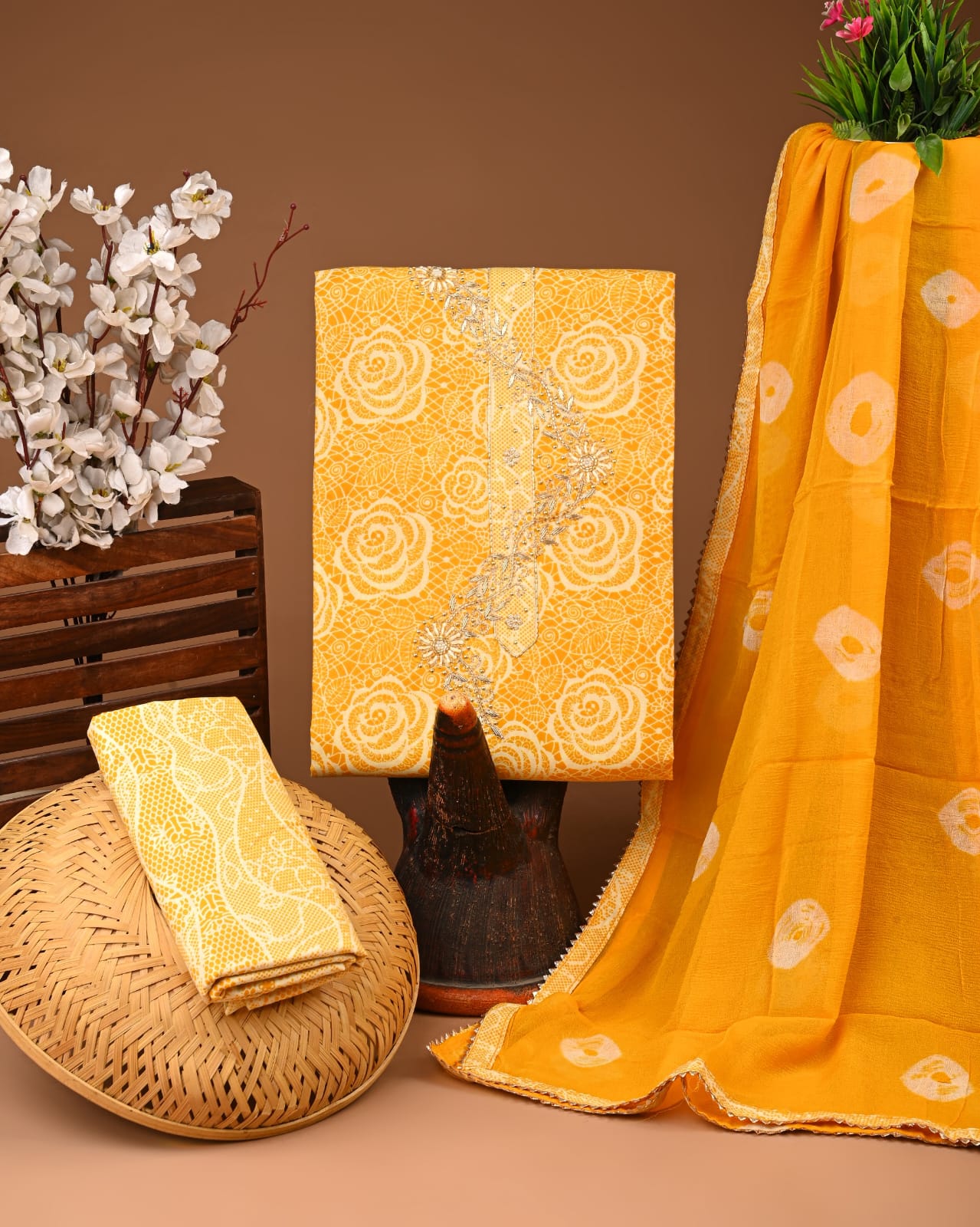 Brighten your day with this artisan-crafted Sunny Floral Gota Patti Cotton Suit Set. The cheerful yellow fabric is adorned with intricate floral motifs, reflecting a joyful spirit that’s perfect for festive gatherings and everyday wear alike.