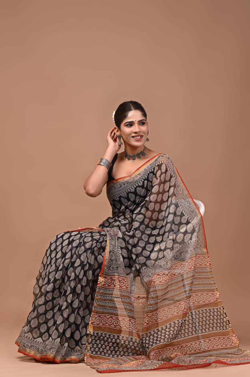 The elegant silk border enhances its traditional charm, while the intricate, multi-color hand block prints are a celebration of artisanal craftsmanship. Each detail tells a story, inviting you to experience the warmth of Indian textile artistry. Whether you’re heading to the office or enjoying a casual outing, this saree is versatile enough to effortlessly transition through occasions.
