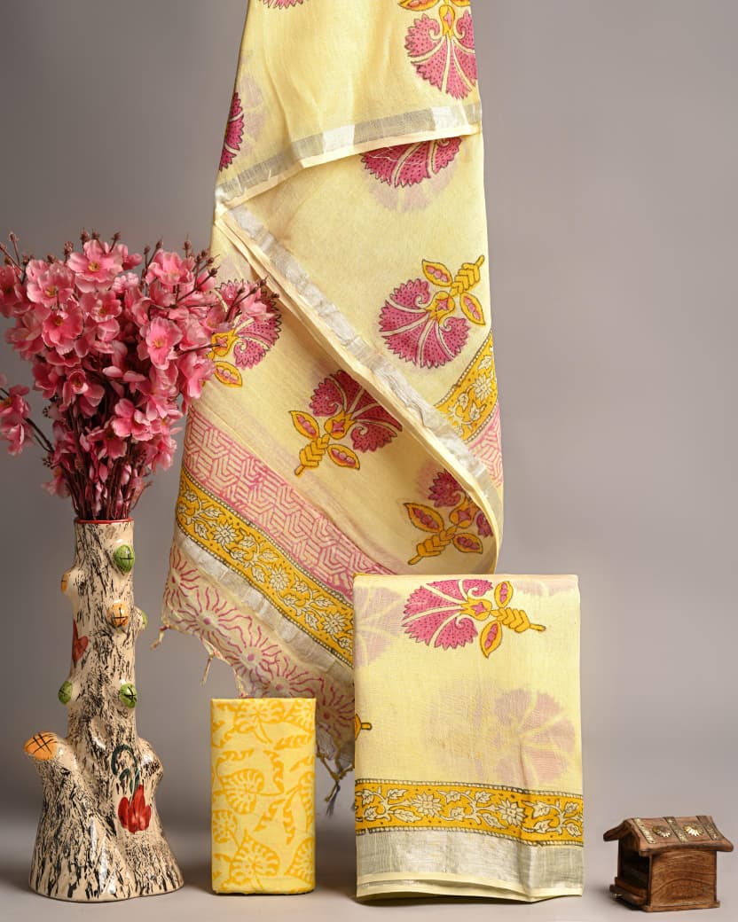Sunshine Blooms Linen Cotton Suit Set with Silver Border